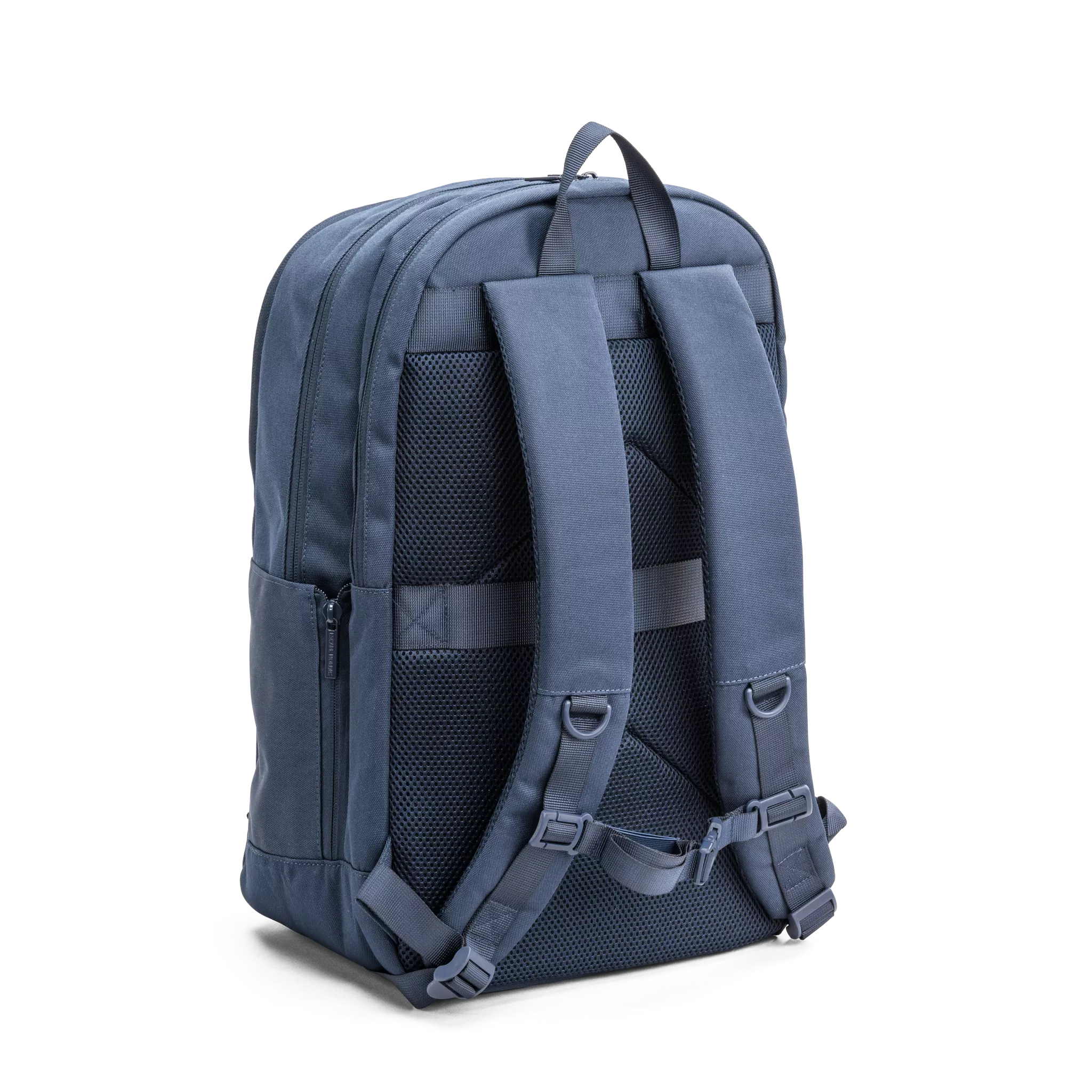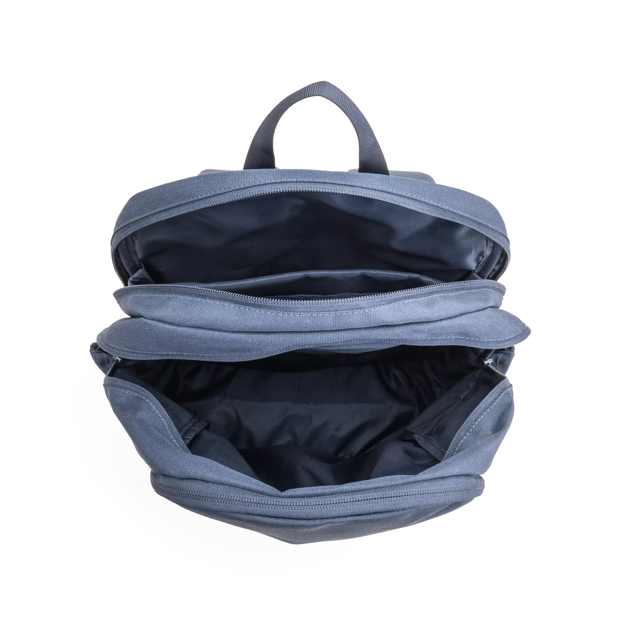 Rymlig, sportig och välorganiserad ryggsäck i vattenavvisande 900D polyester, från Escape Nordic. Tre blixtlåsförsedda huvudfack. Det bakre av dessa har ett öppet vadderat fack för bärbar dator, det mellersta har ett djupt öppet fack, det främre, nättare facket passar till A4 dokument eller block. Väskans sidor har öppna fack, lämpliga för vattenflaska eller paraply. Vadderade, 6,5 cm breda reglerbara axelremmar. Vadderad och ventilerad ryggplatta, med textilband, för att fästa på en resväskas teleskophandtag. Avtagbart och reglerbart bröstband. Enkelt bärhandtag på toppen.
