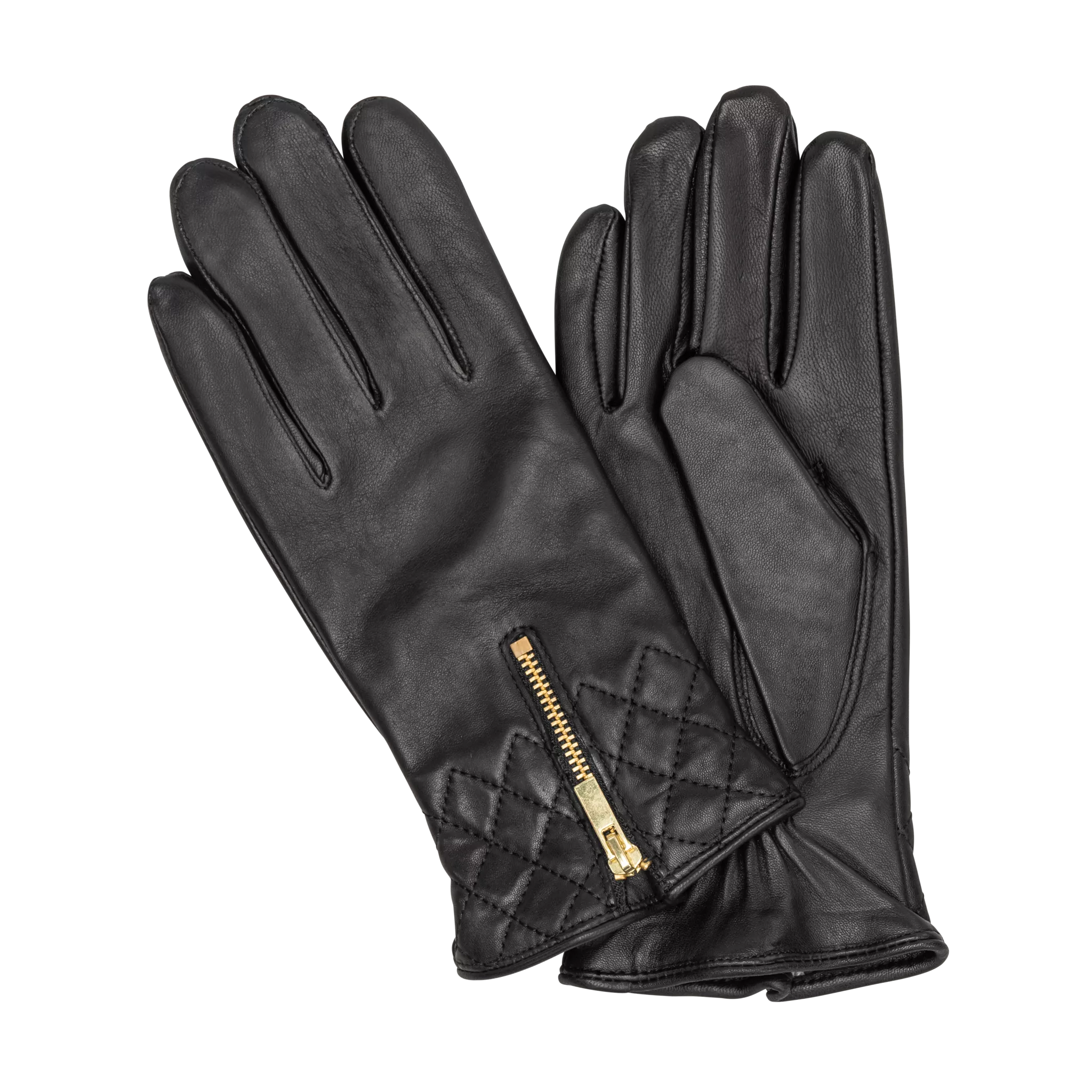 Sofistikerade och eleganta damhandskar av mjuk lammnappa. Denna modell har en guldfärgad metalldragkedja samt quiltat mönster. Fodrade med mjukt stickat yllefoder.