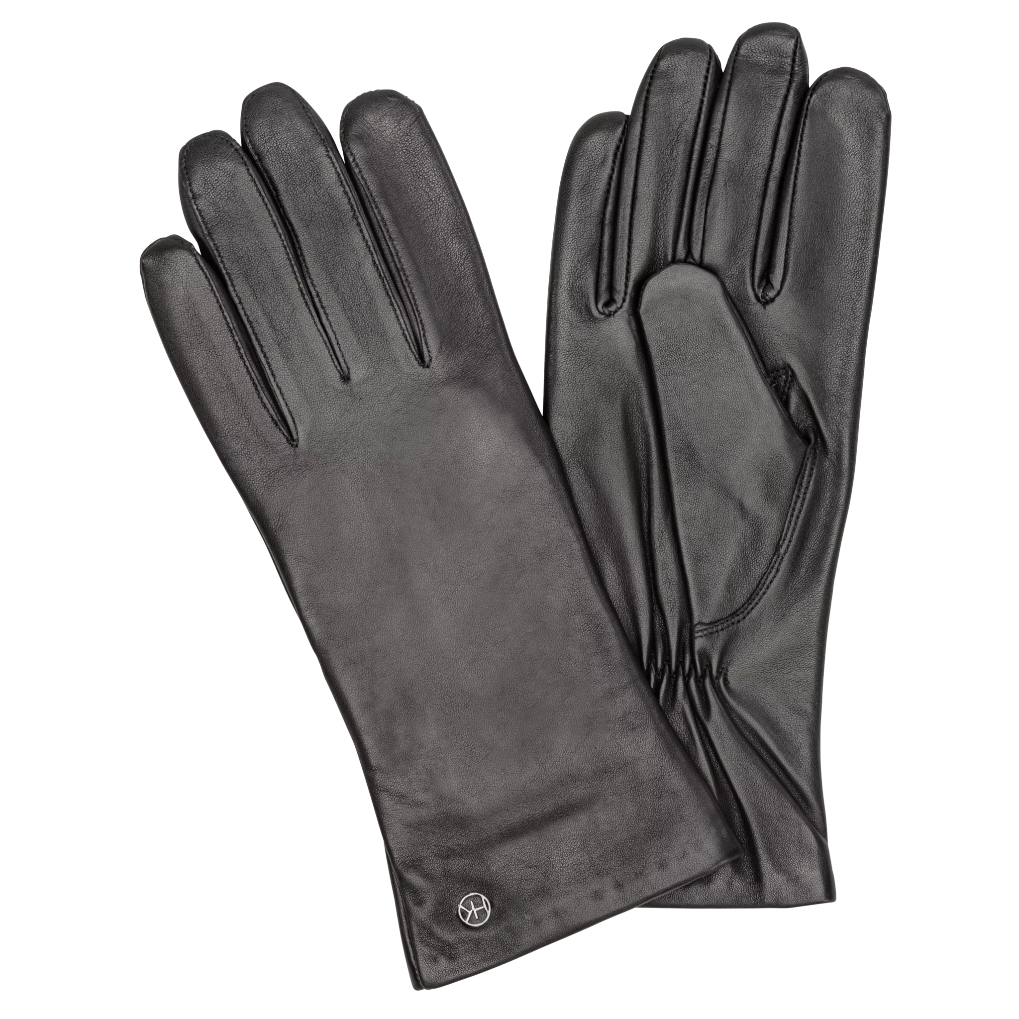 Eleganta, släta damhandskar i klassisk modell av mjuk och följsam lammnappa. Dekorativ metallogo på skaftet. Fodrade med ett mjukt och varmt blandfoder av ull och kashmir.