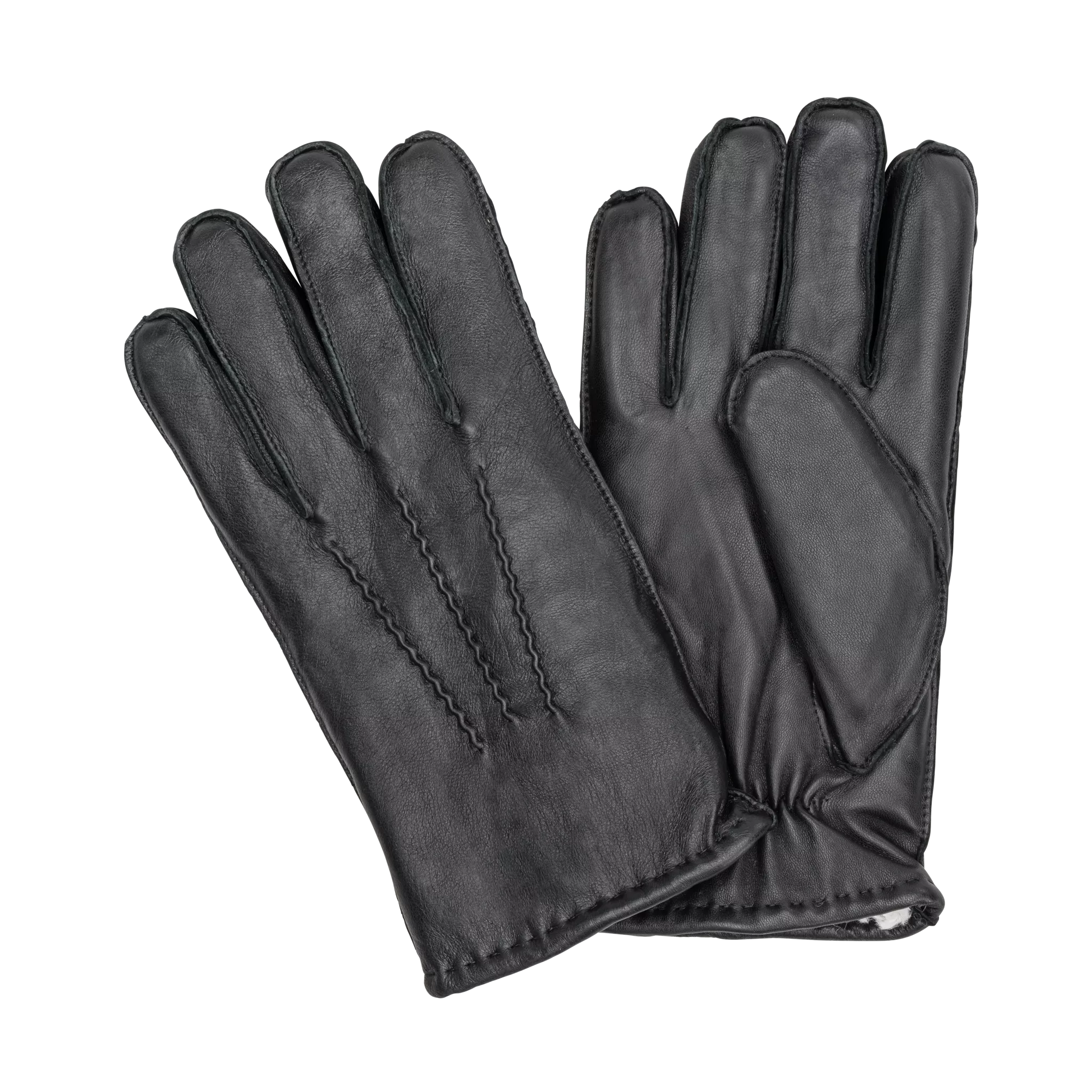 Smidiga handskar av svart fårnappa med dekorsöm på handryggen. Fodrade med mjuk pälsimitation av polyester.