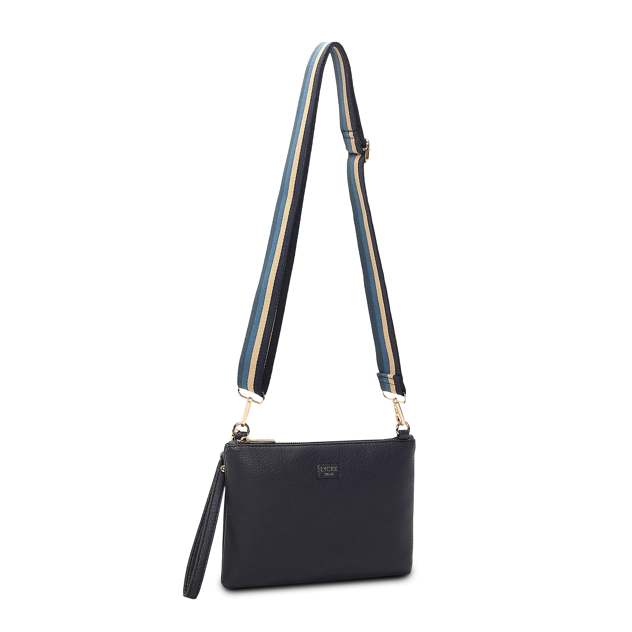 Slimmad stilig axelväska i clutch-modell, tillverkad av mjuk skinnimitation, från Lycke Oslo. Väskan kan bäras både som en crossover med sin långa reglerbara rem och som en clutch med sin handledsrem. Passar lika bra till vardags som till fest!