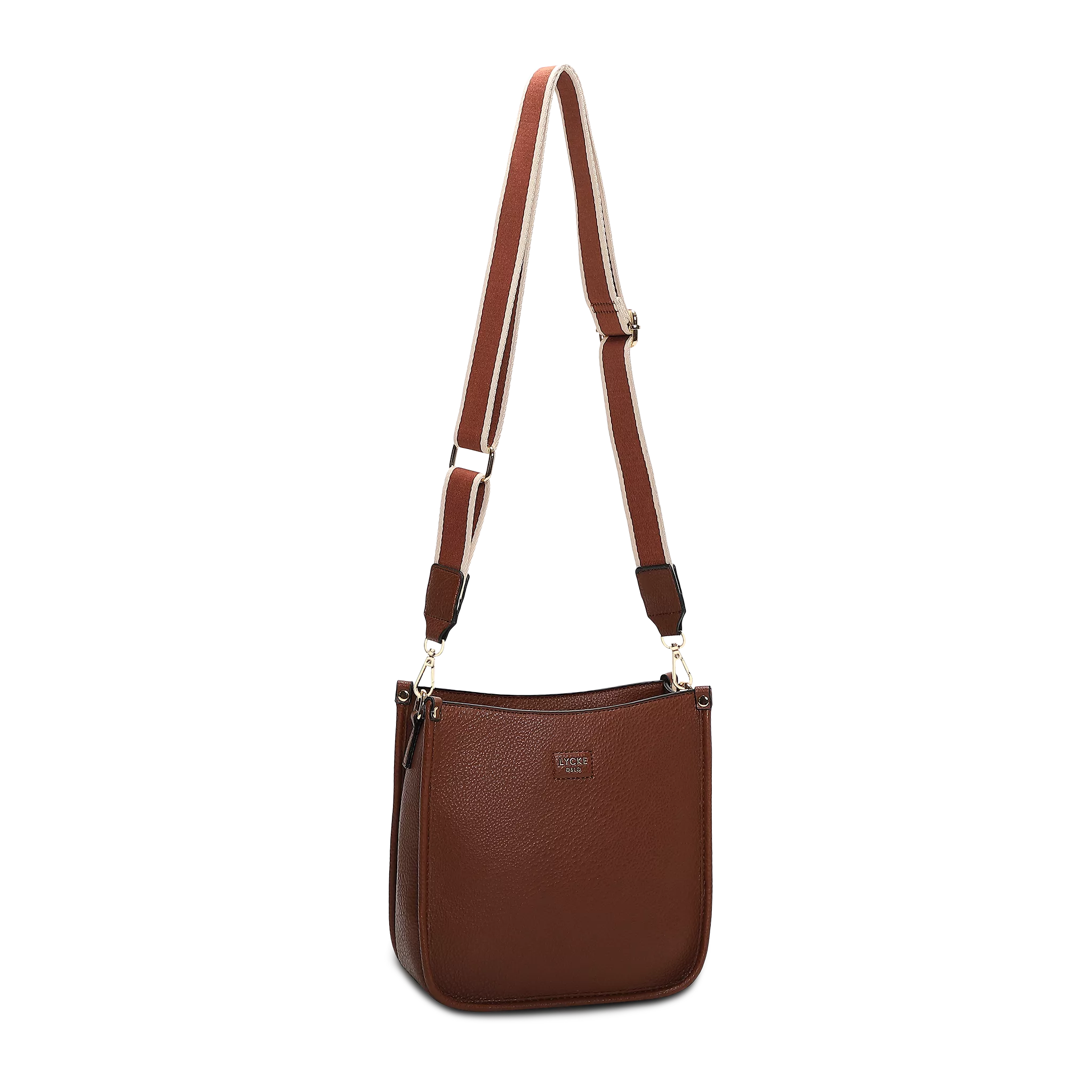 Tuff axelväska i crossovermodell med ett stramt enkelt uttryck, tillverkad av mjuk skinnimitation, från Lycke Oslo. Huvudfacket stängs med blixtlås. Fräsch, avtagbar flerfärgad textilaxelrem. Modellen har rundade kanter, upptill har den dekorativa nitar, för en exklusivare look och detaljer i guld.