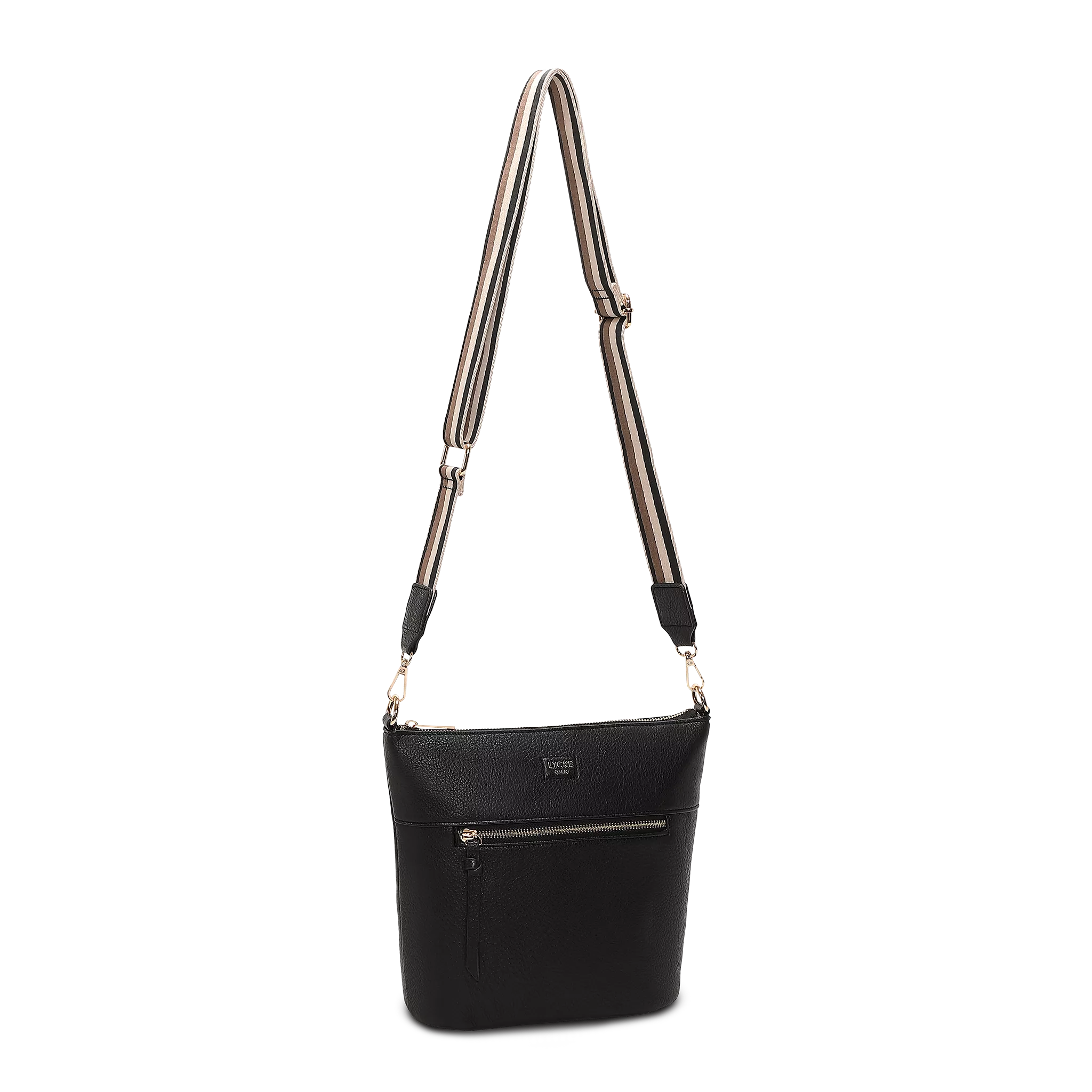 Nätt crossover i trendig hinkmodell från Lycke Oslo, tillverkad av mjuk skinnimitation. Stadig, bred botten gör väskan rymlig. Läckert randig axelrem, som enkelt justeras till lämplig längd.