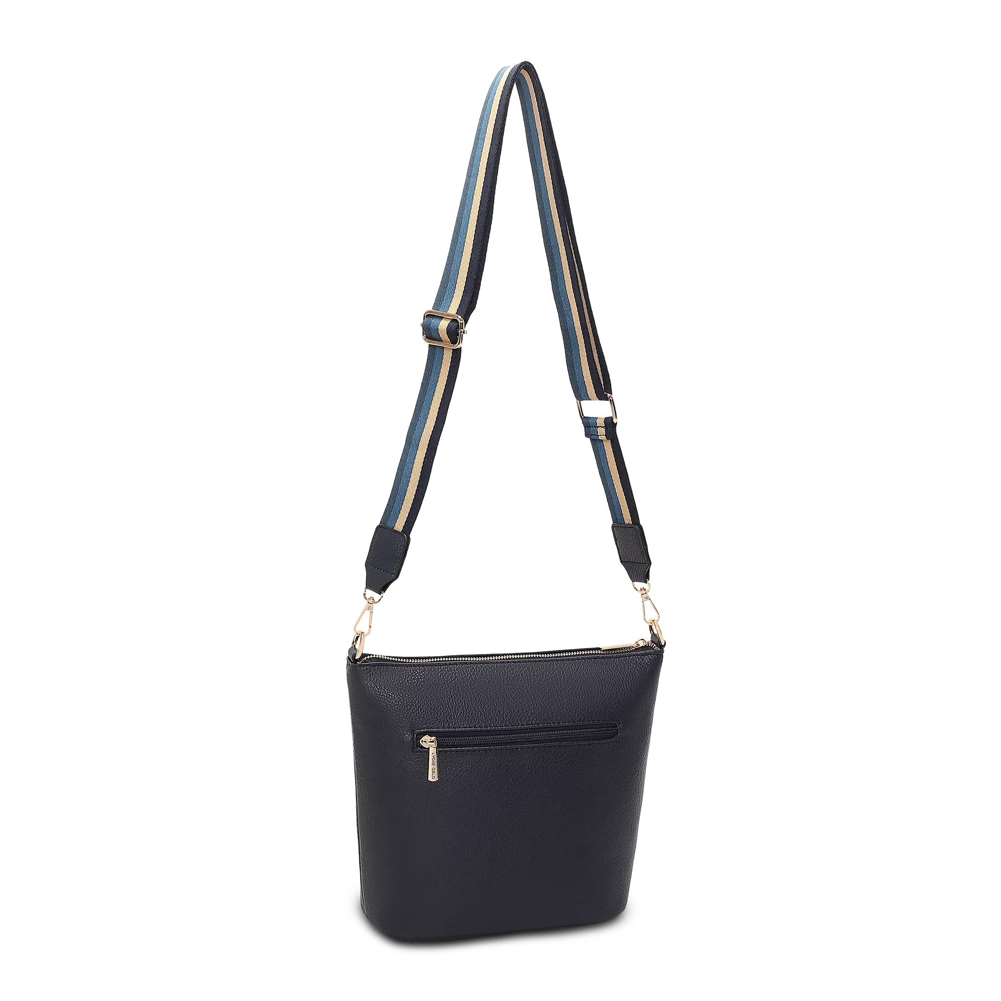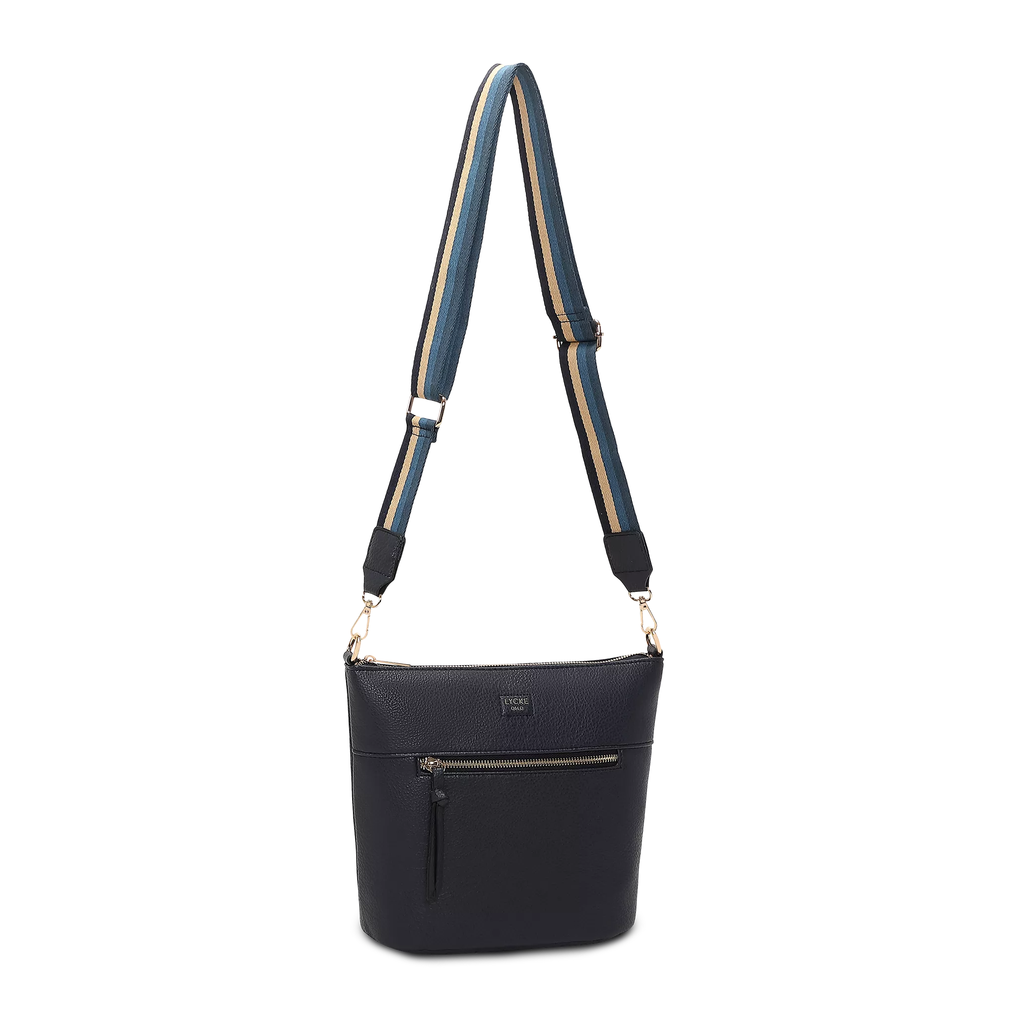 Nätt crossover i trendig hinkmodell från Lycke Oslo, tillverkad av mjuk skinnimitation. Stadig, bred botten gör väskan rymlig. Läckert randig axelrem, som enkelt justeras till lämplig längd.