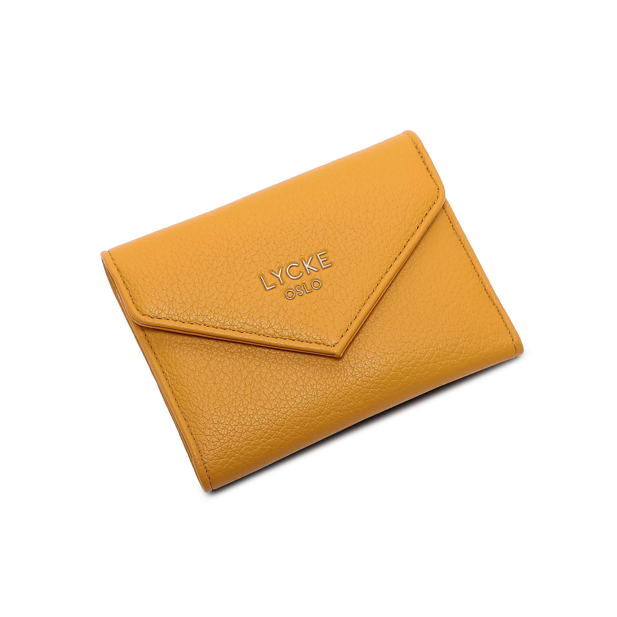 Liten smidig plånbok tillverkad av mjuk skinnimitation från Lycke Oslo. Inuti har den ett långt öppet fack för sedlar, ett mindre blixtlåsack och plats för åtta kort. Plånboken stängs med tryckknapp.