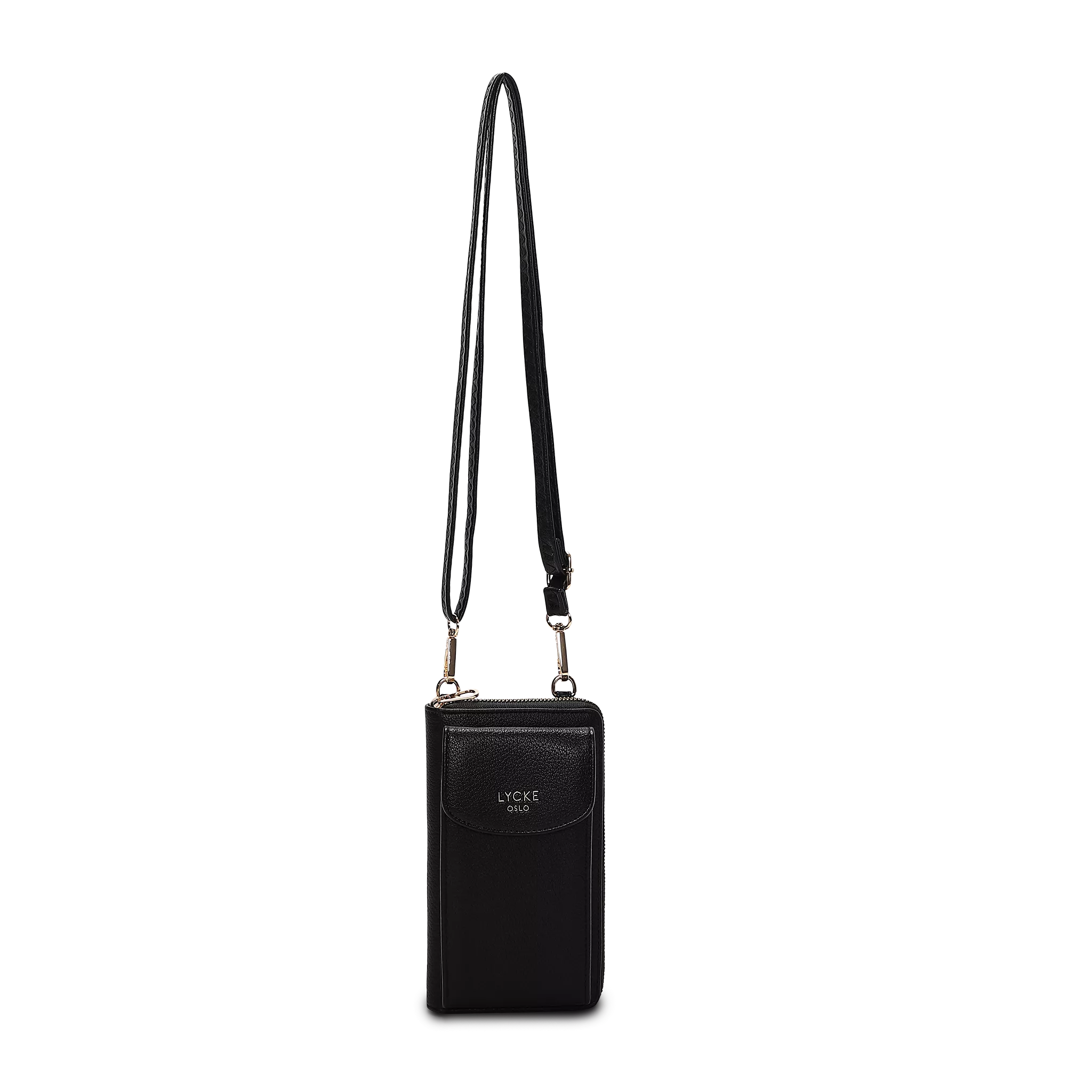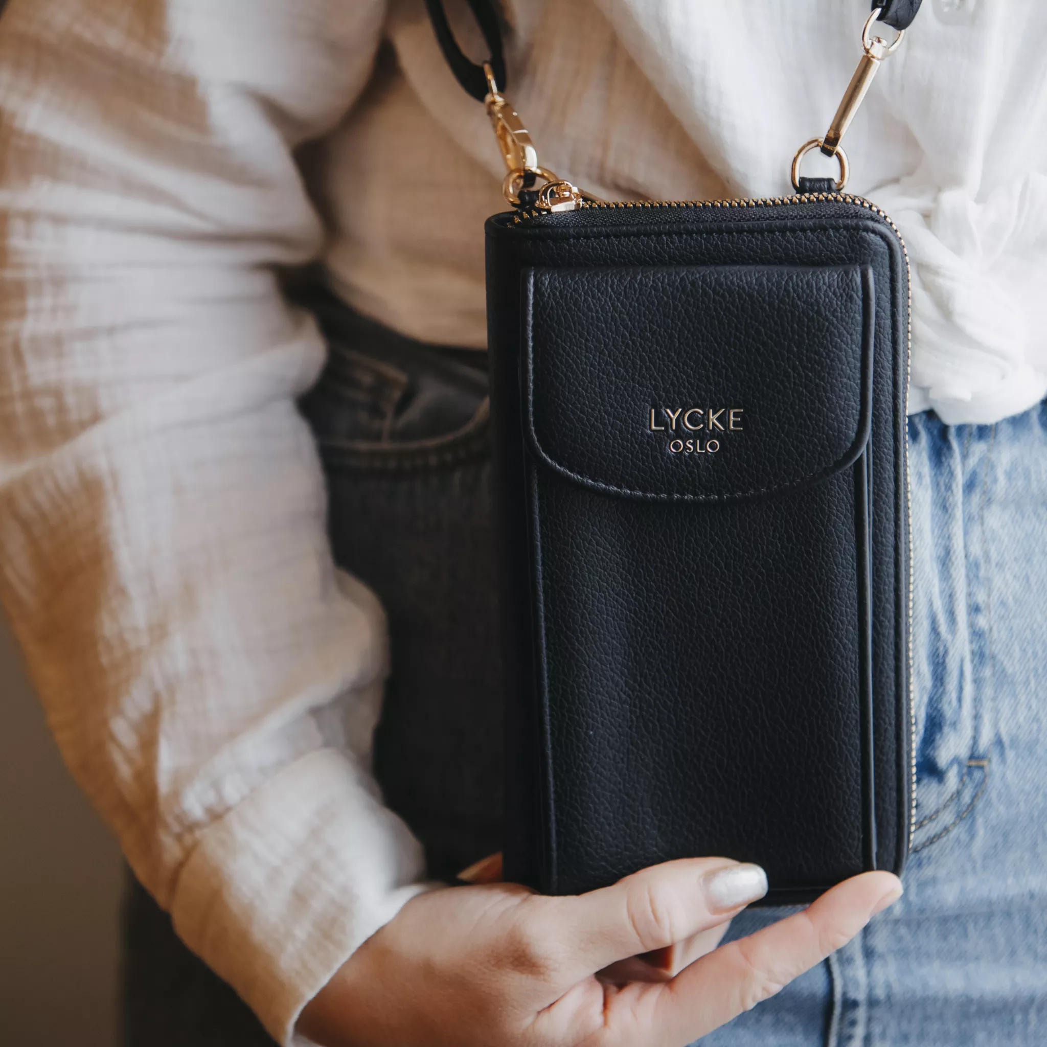 Toppensmidig telefonväska i crossover-modell tillverkad av fin skinnimitation med struktur på ytan, från Lycke Oslo. Behändig och nätt, rymmer iPhone + i framsidans lockficka.