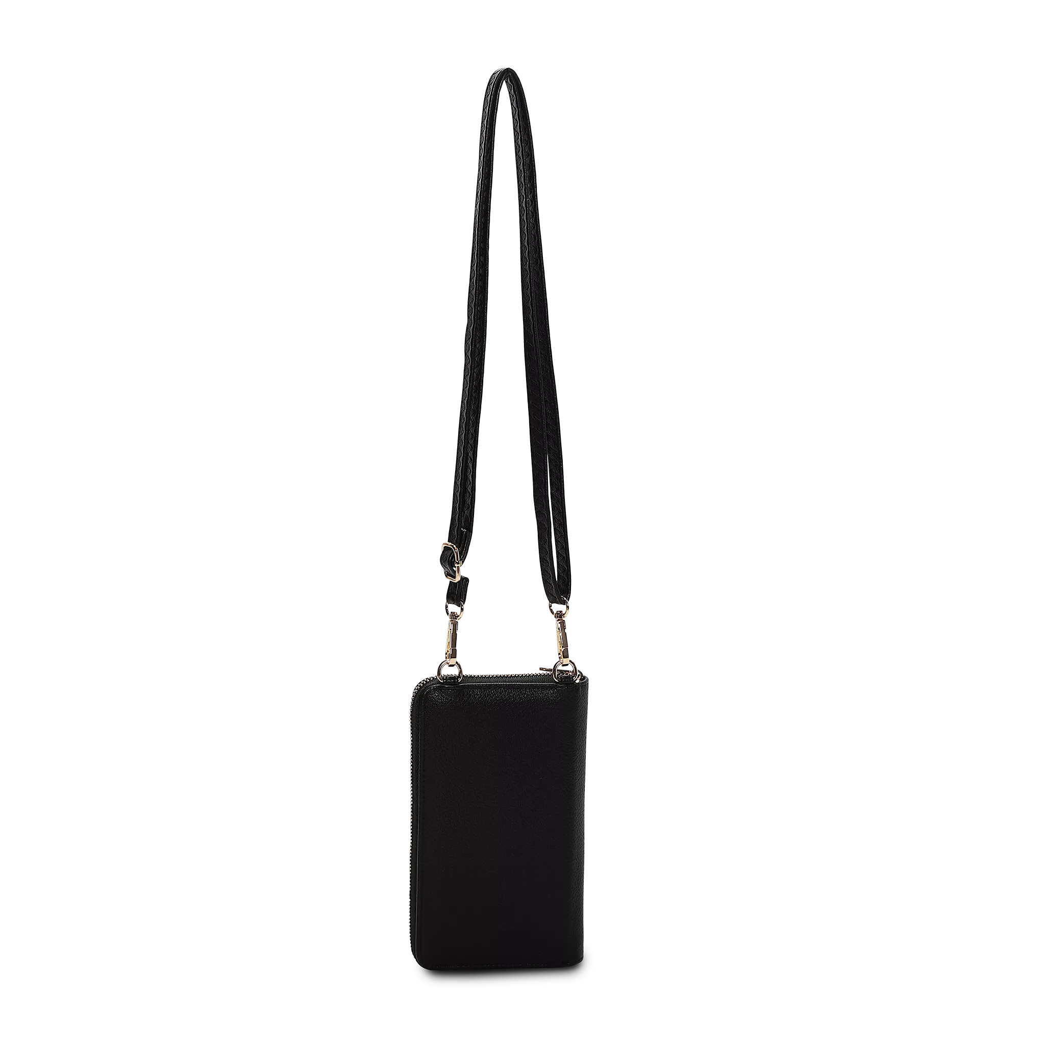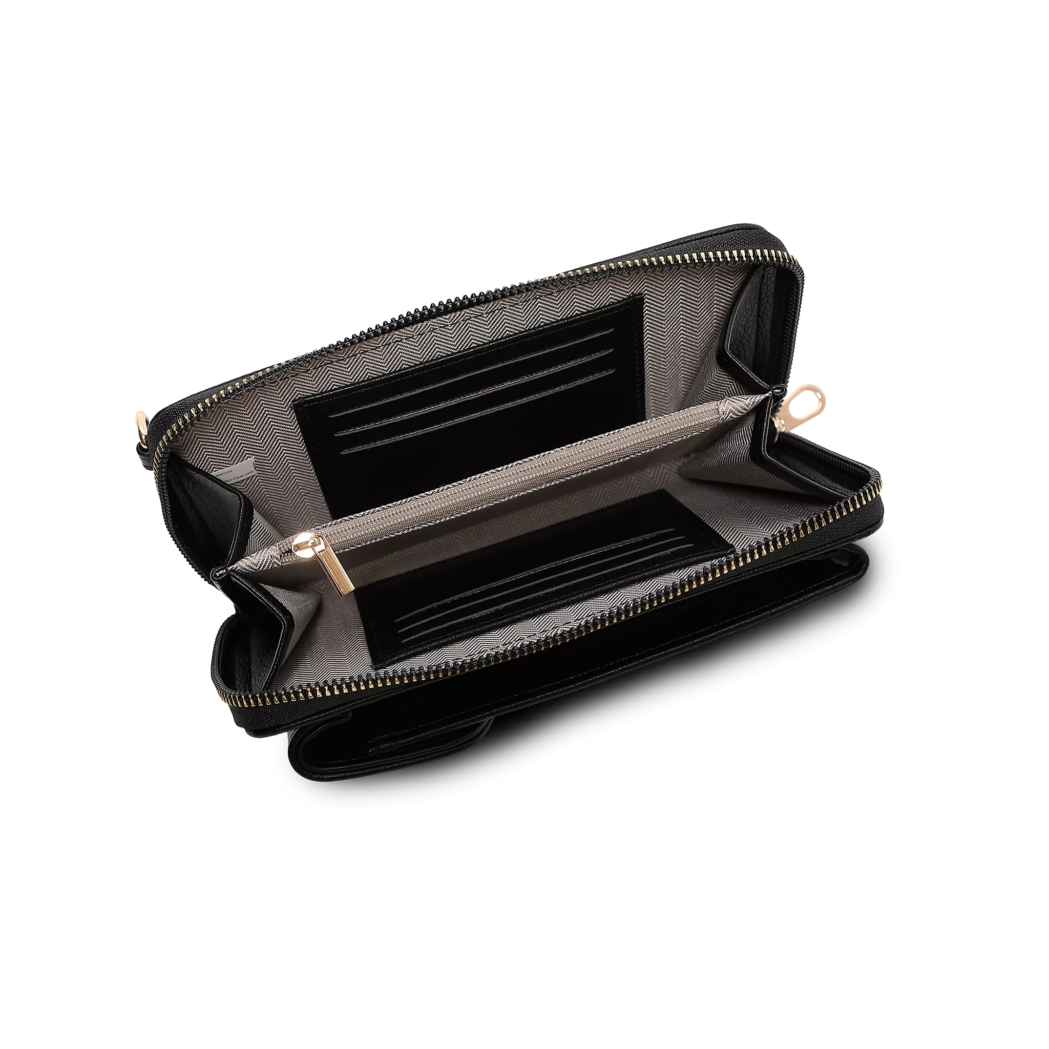 Toppensmidig telefonväska i crossover-modell tillverkad av fin skinnimitation med struktur på ytan, från Lycke Oslo. Behändig och nätt, rymmer iPhone + i framsidans lockficka.