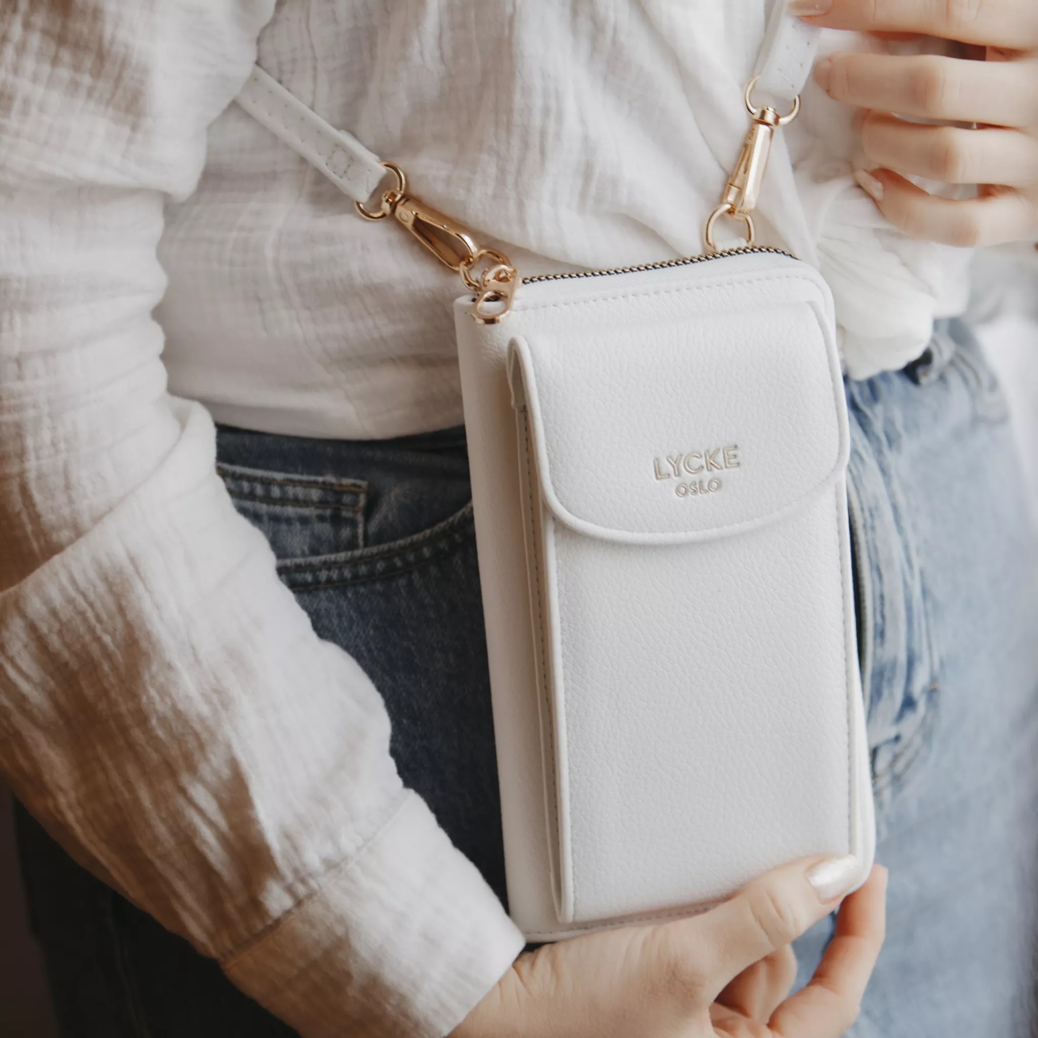Toppensmidig telefonväska i crossover-modell tillverkad av fin skinnimitation med struktur på ytan, från Lycke Oslo. Behändig och nätt, rymmer iPhone + i framsidans lockficka.