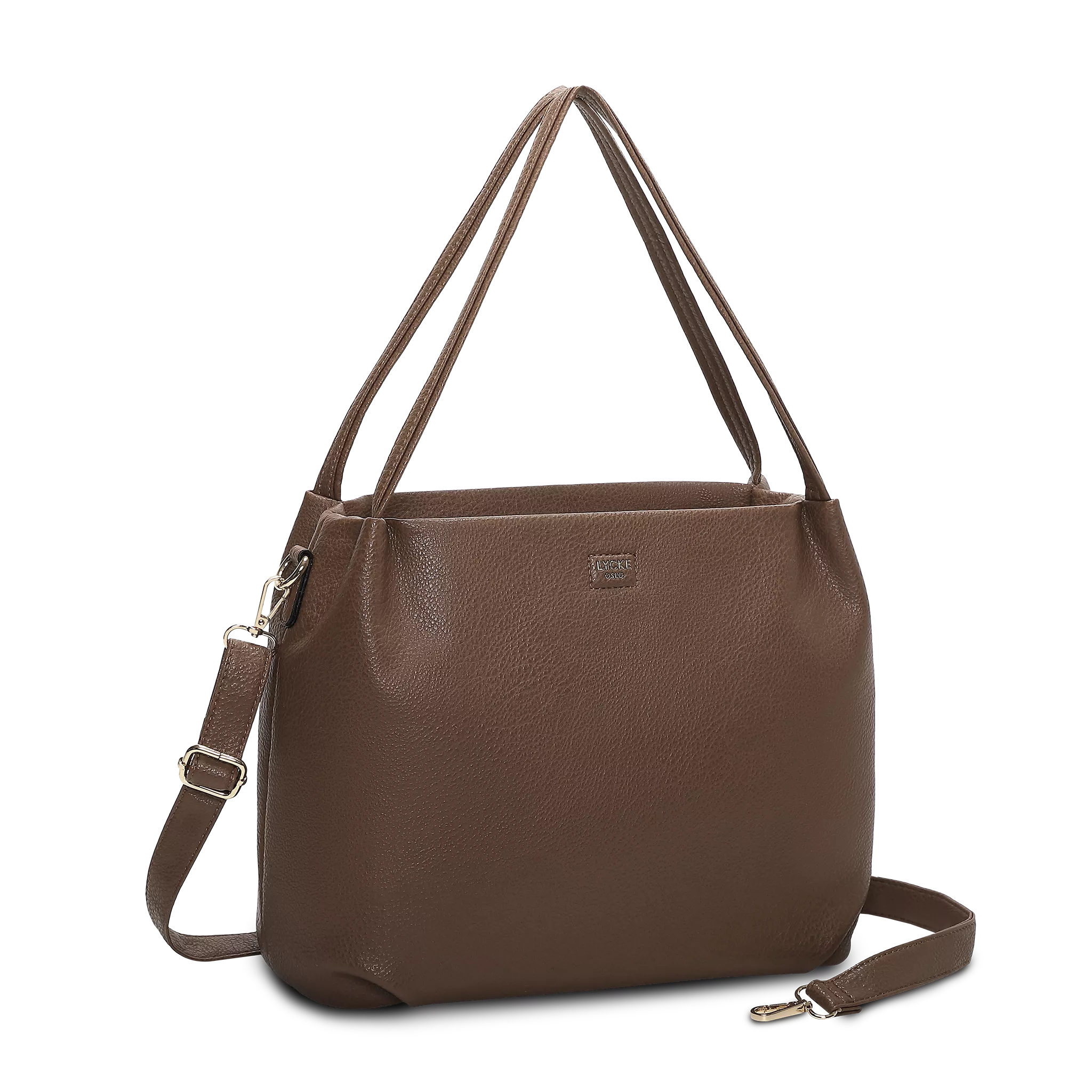 Fräsch och rymlig handväska i mjuk skinnimation från Lycke Oslo. Väskan är rundad i modellen, huvudfacket stängs med blixtlås. Den kan bäras i handen, på armen, på axeln eller crossbody. Den har både två fasta handtag och en avtagbar, steglöst justerbar axelrem.