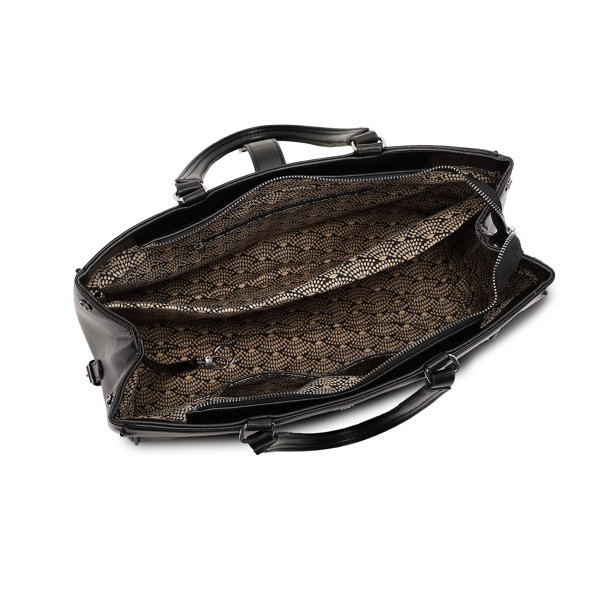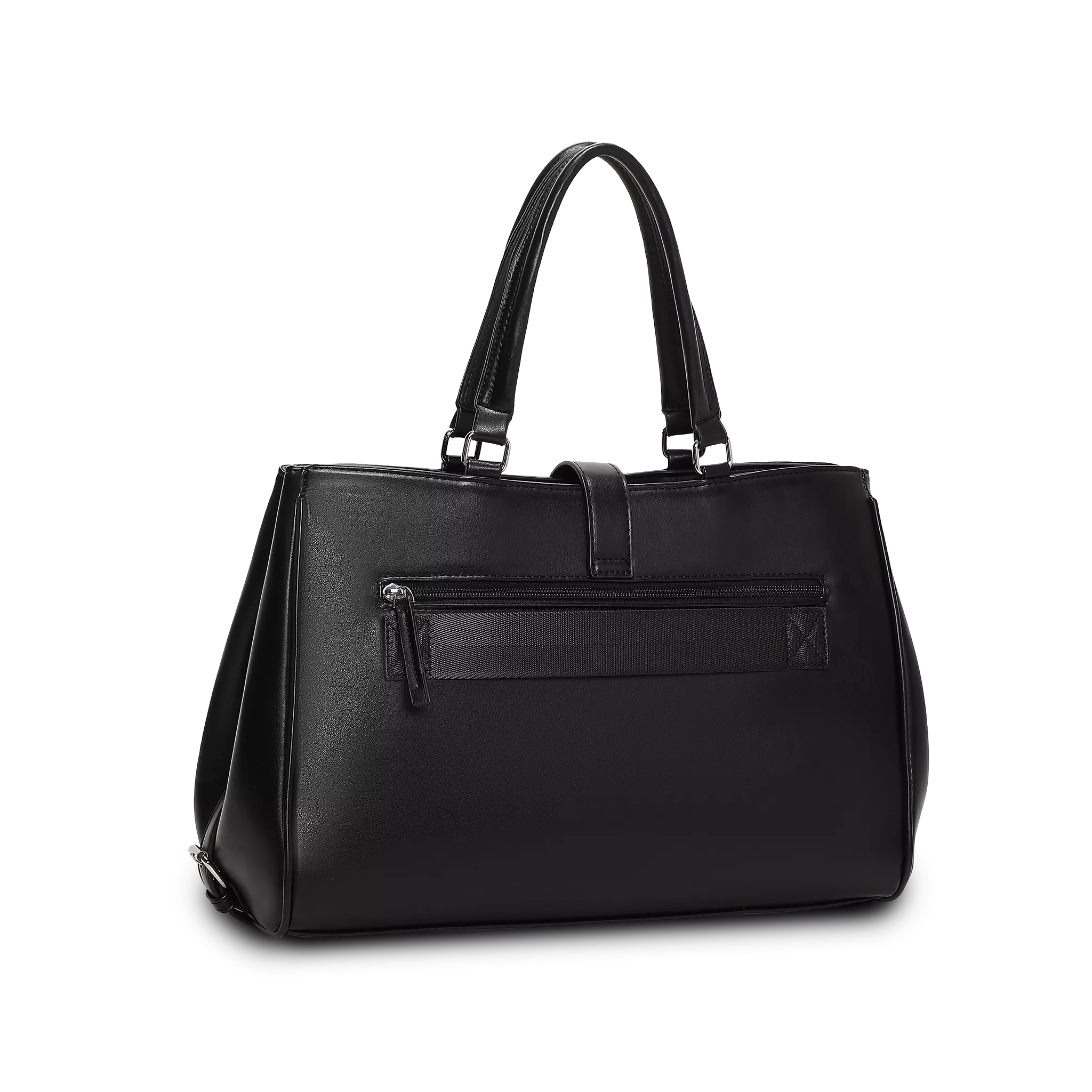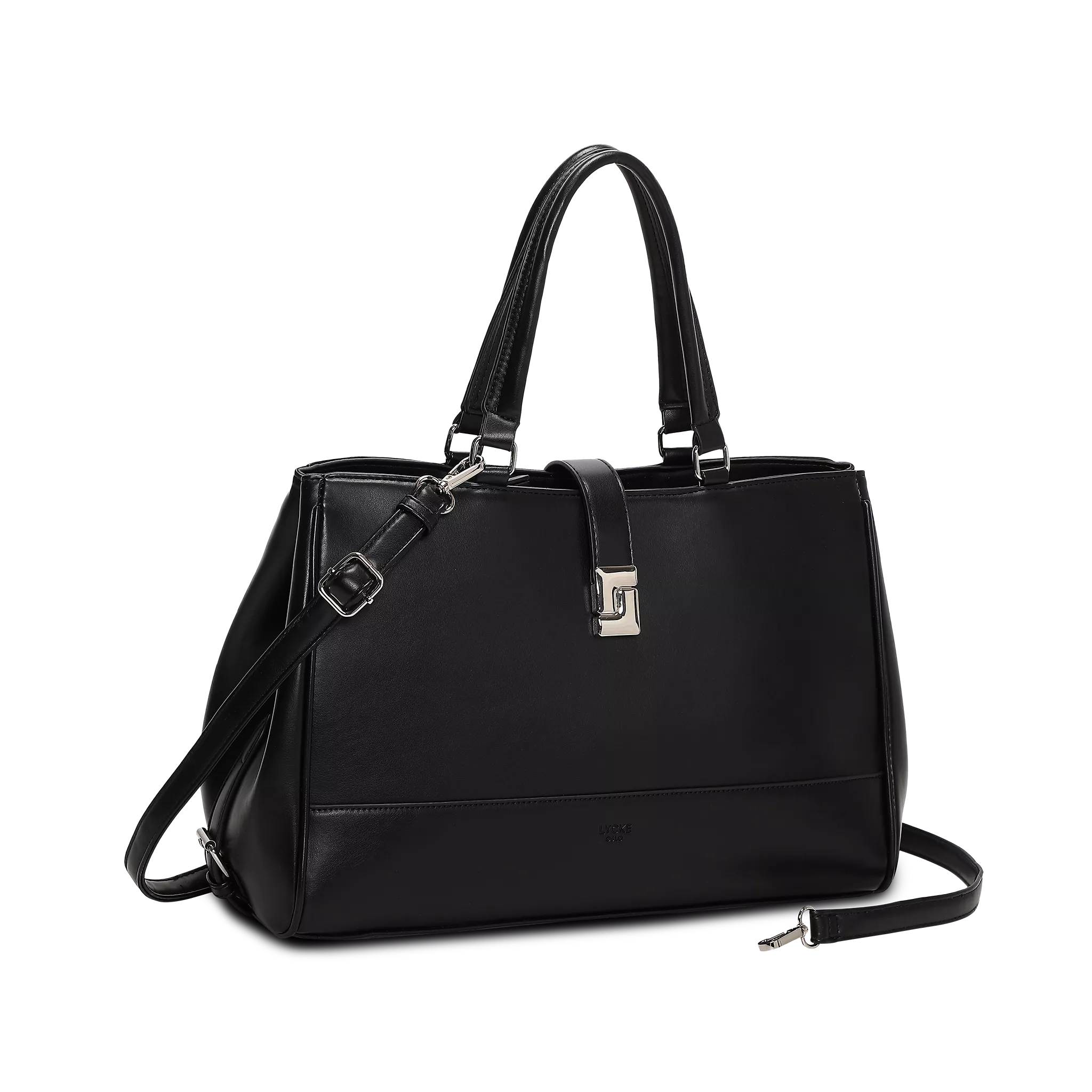 Rejält tilltagen handväska i större storlek tillverkad av fantastisk mjuk skinnimitation, från Lycke Oslo. Perfekt storlek som skolväska eller till jobbet då den rymmer både den bärbara, mindre datorn, A4 och matlådan. Baksidan har textilband som gör att du enkelt och säkert kan transportera den på en resväskas draghandtag.