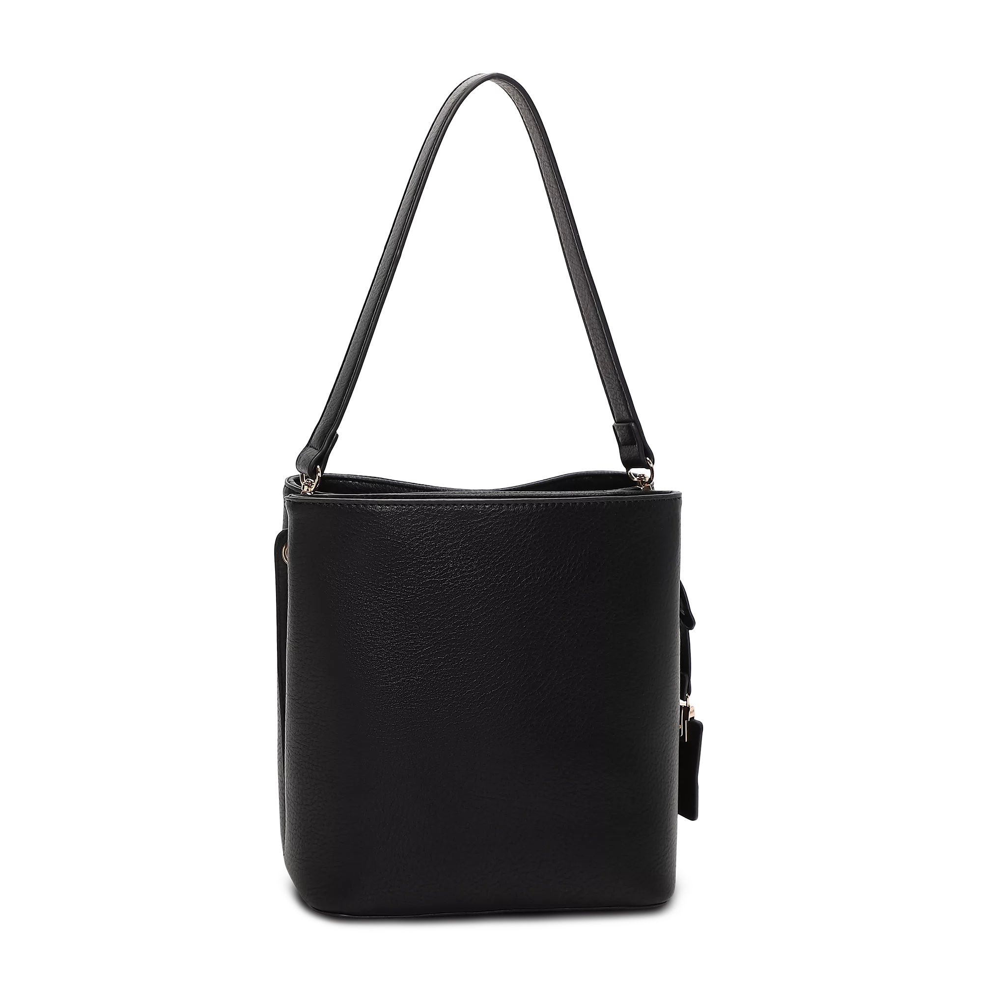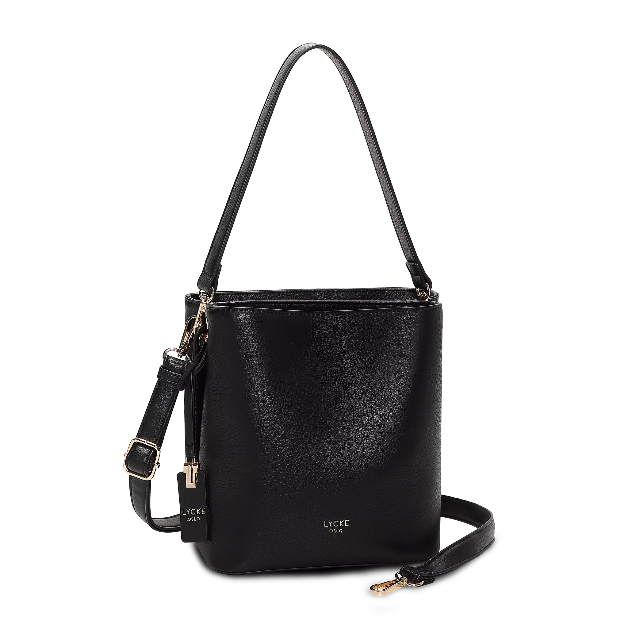 Nätt och stiligt läcker mindre bucket bag från Lycke Oslo. Den är tillverkad av dubbelsidig skinnimitation, med läckert skimrande baksida. Stilren skandinavisk design med gulddetaljer för dig som vill ha en clean look. Stilig, avtagbar hängdekoration.