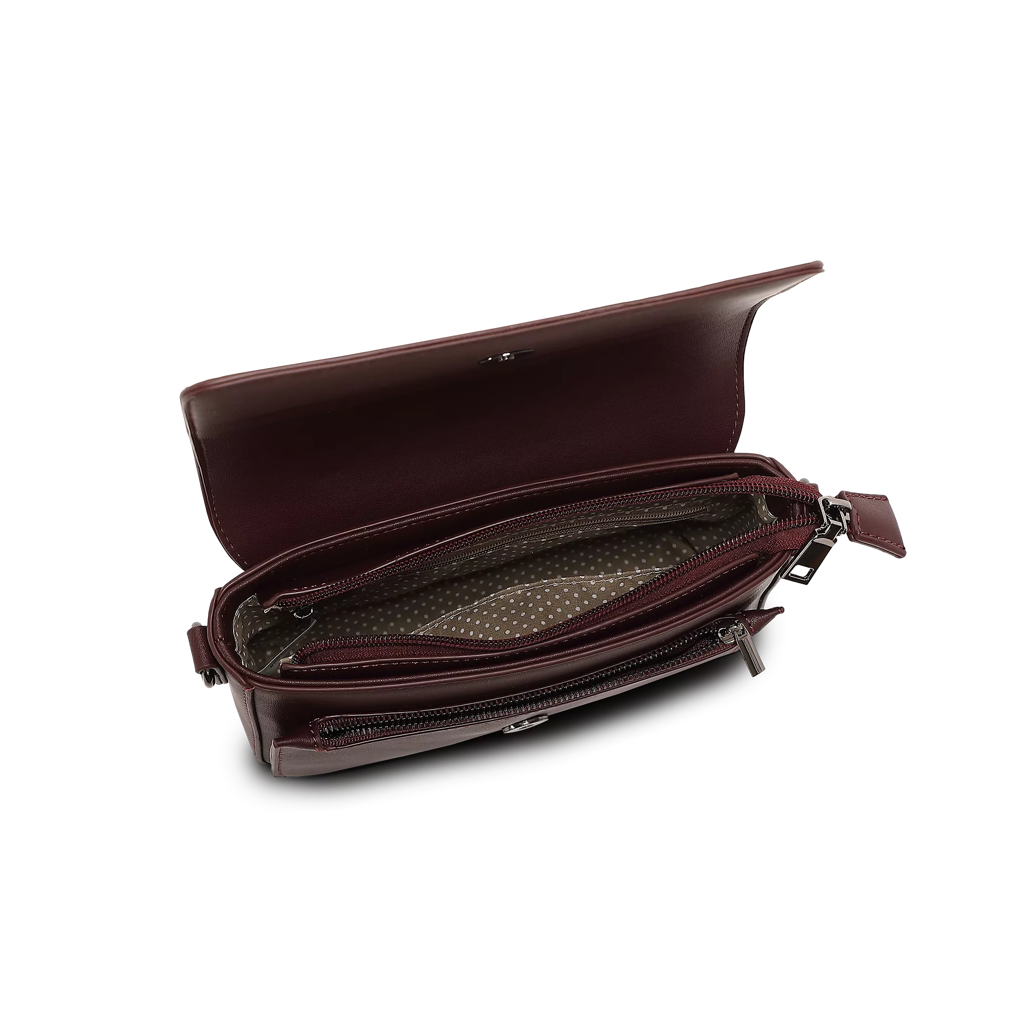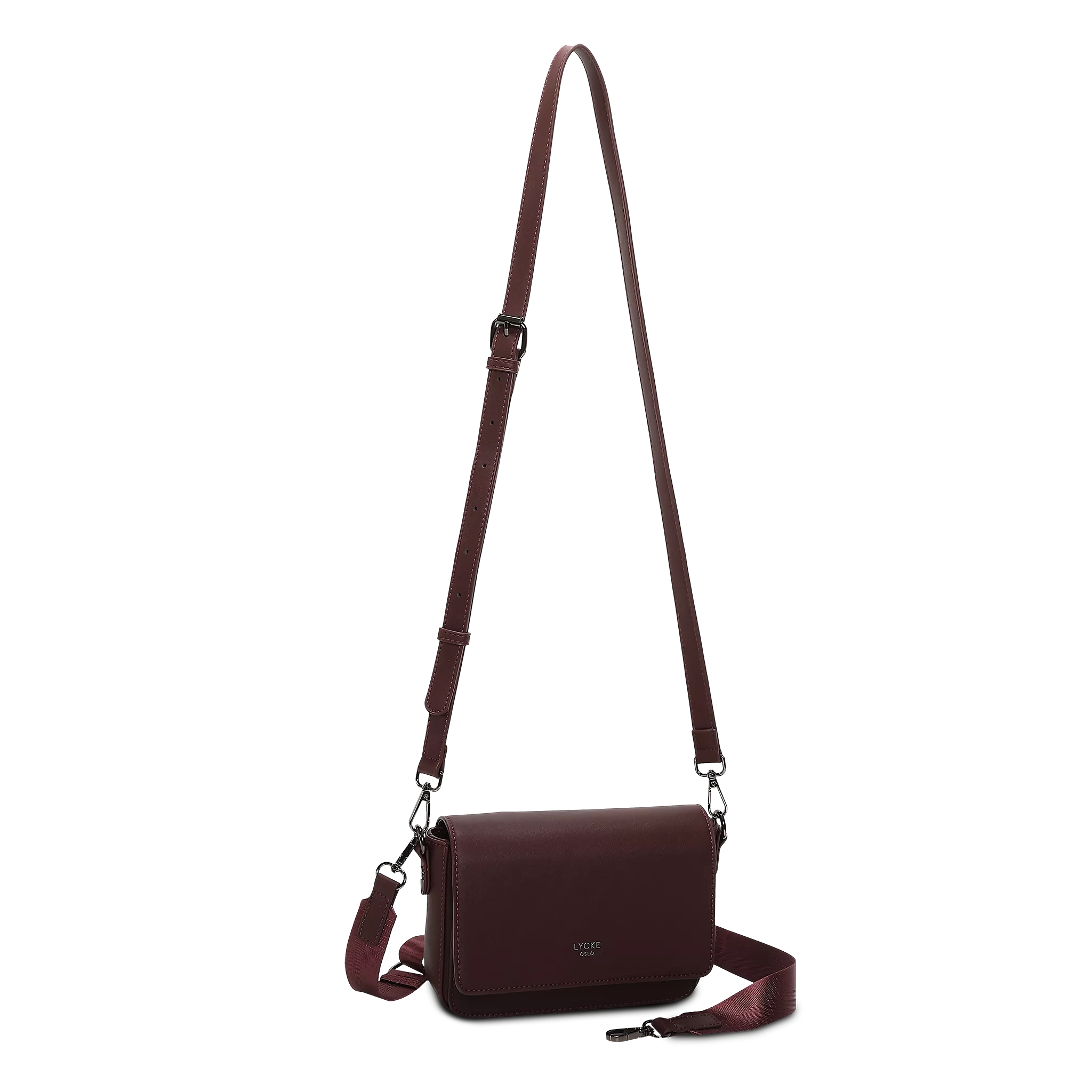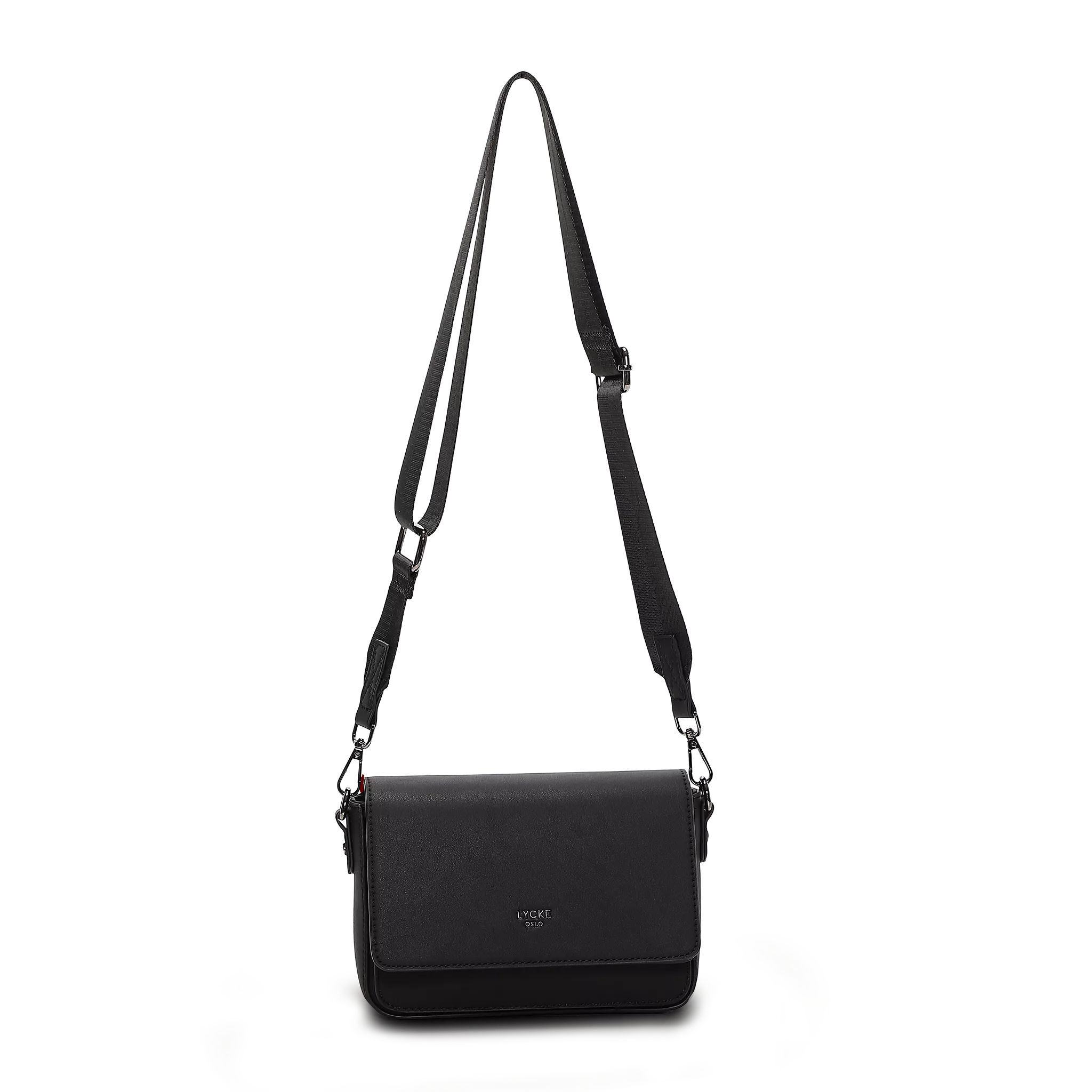 Handväska i crossover-modell i skandinaviskt enkel och klassisk design av slät skinnimitation, från Lycke Oslo. Väskan stängs med klaff, försedd med magnetlås. Huvudfacket är även förslutet med blixtlås, och fronten pryds av ett nätt blixtlåsförsett fack. Väskan har dubbla, avtagbara axelremmar och bärs på axeln eller crossbody.