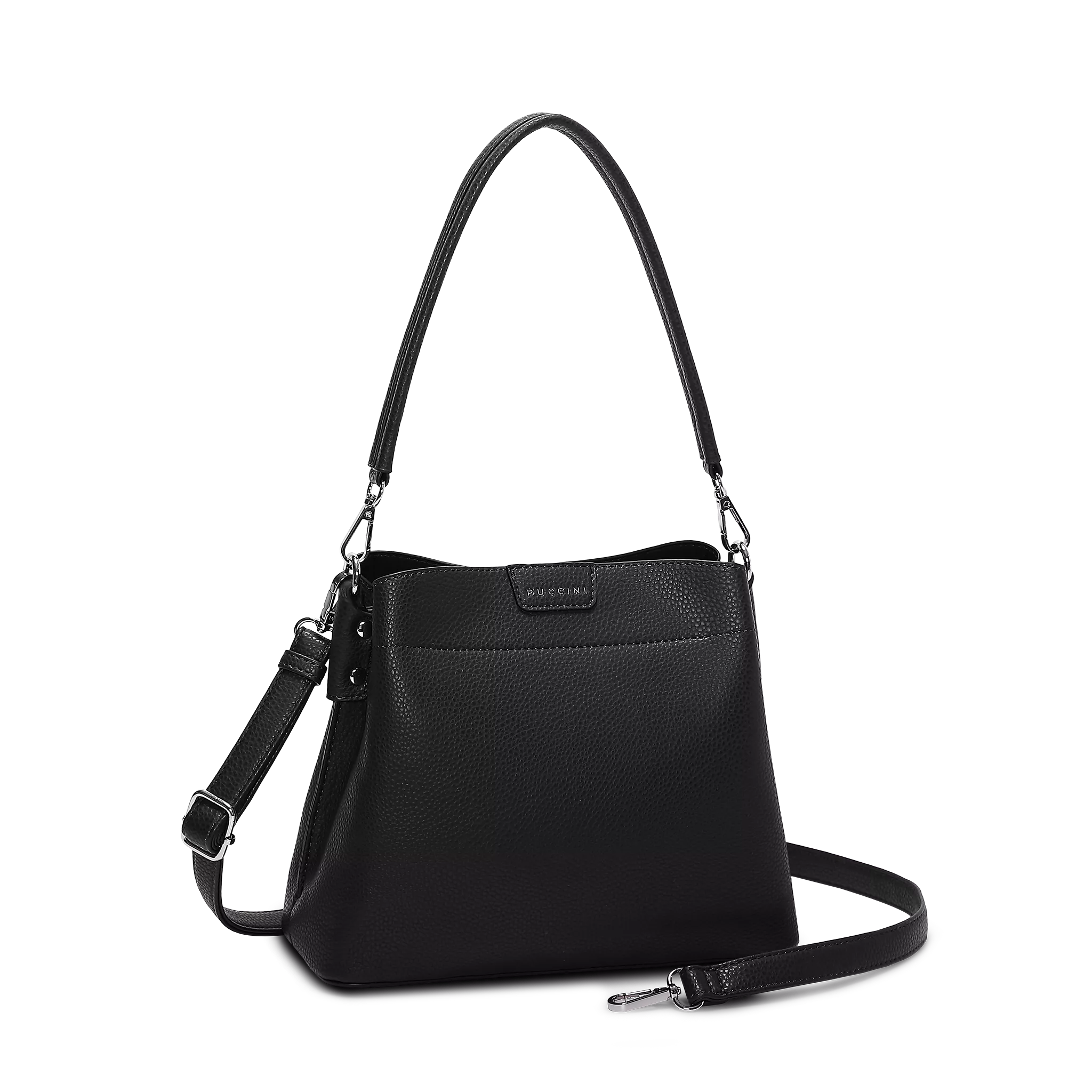 Välinredd och stilig handväska i crossovermodell från Puccini, tillverkad av härlig skinnimitation med struktur. Rejäl botten med metallfötter, vilket gör att du enkelt kan ställa den ifrån dig. Huvudfacket stängs med hjälp av blixtlås och inuti finns ett mittfack med blixtlås som hjäper dig organisera dina tillhörigheter. Bär den i handen, på armen, axeln, eller crossbody.