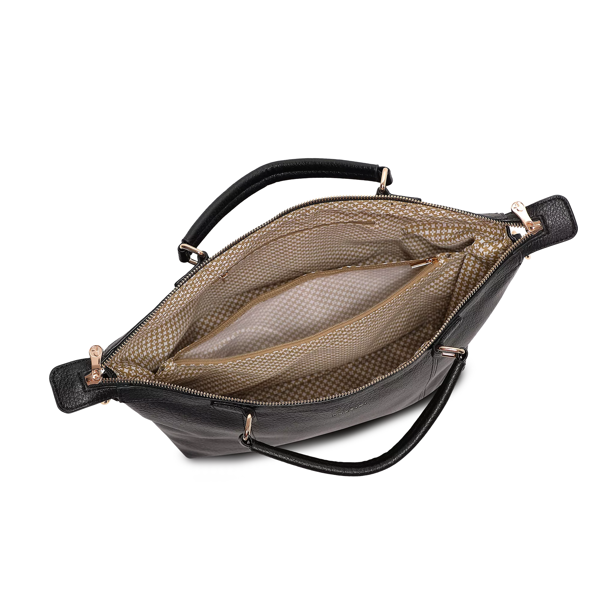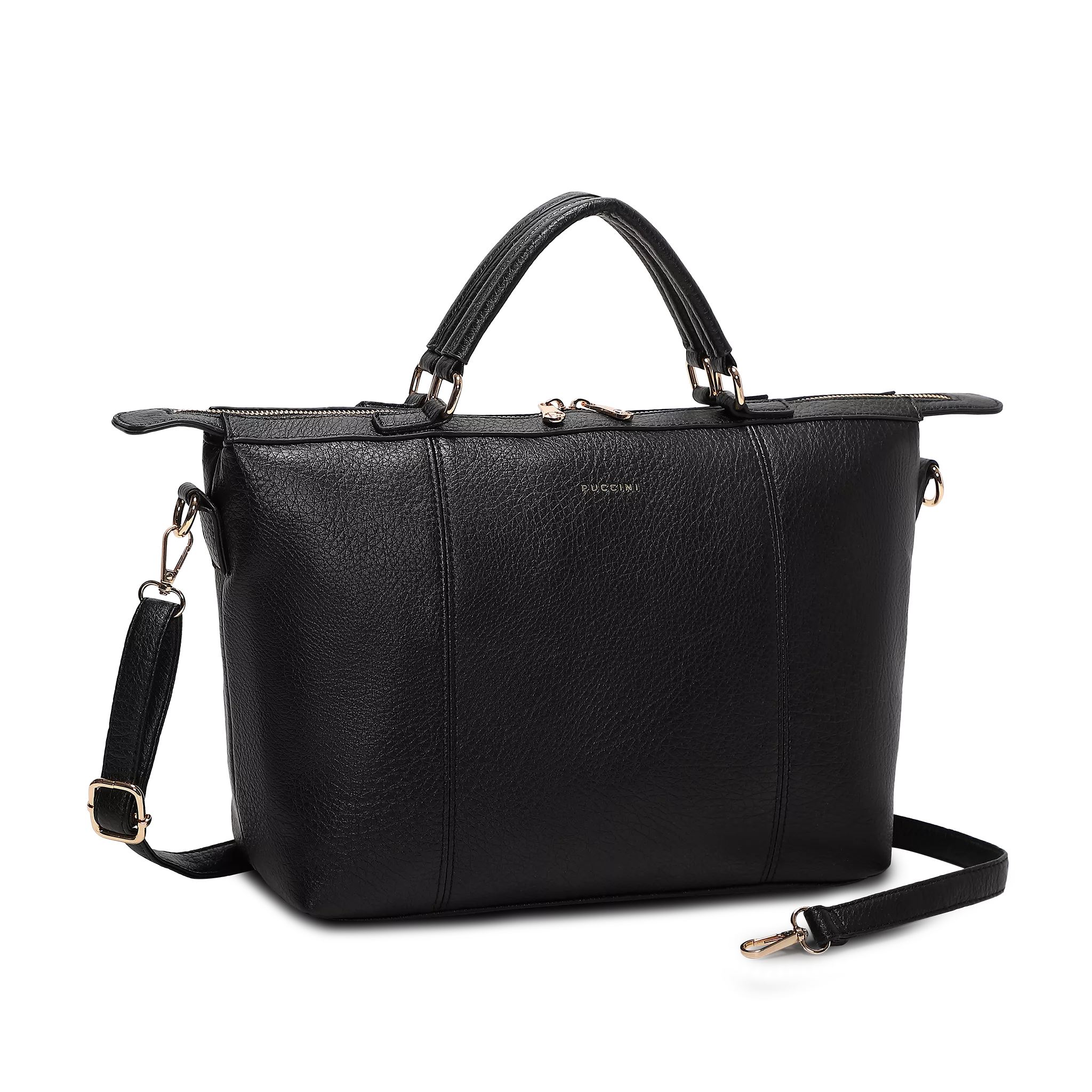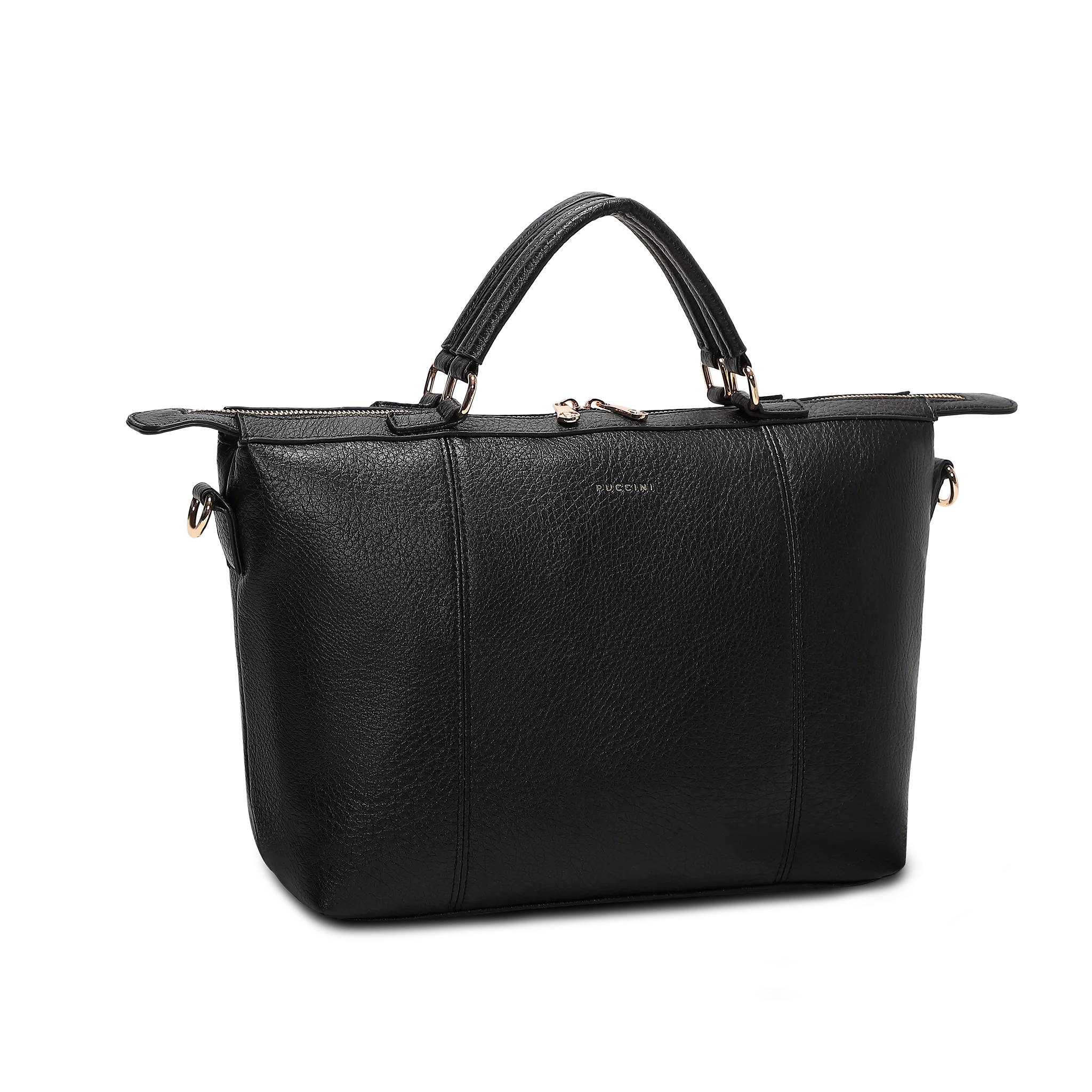 Läcker, större handväska, tillverkad av mjuk, strukturerad skinnimitation, från Puccini. Huvudfacket försluts med blixtlås och inuti finns ett mittfack med blixlås , vilket ger två huvudfack. Frontens dekorsömmar ger ett arbetat uttryck och den breda botten med dess metalltassar ger bra skydd.