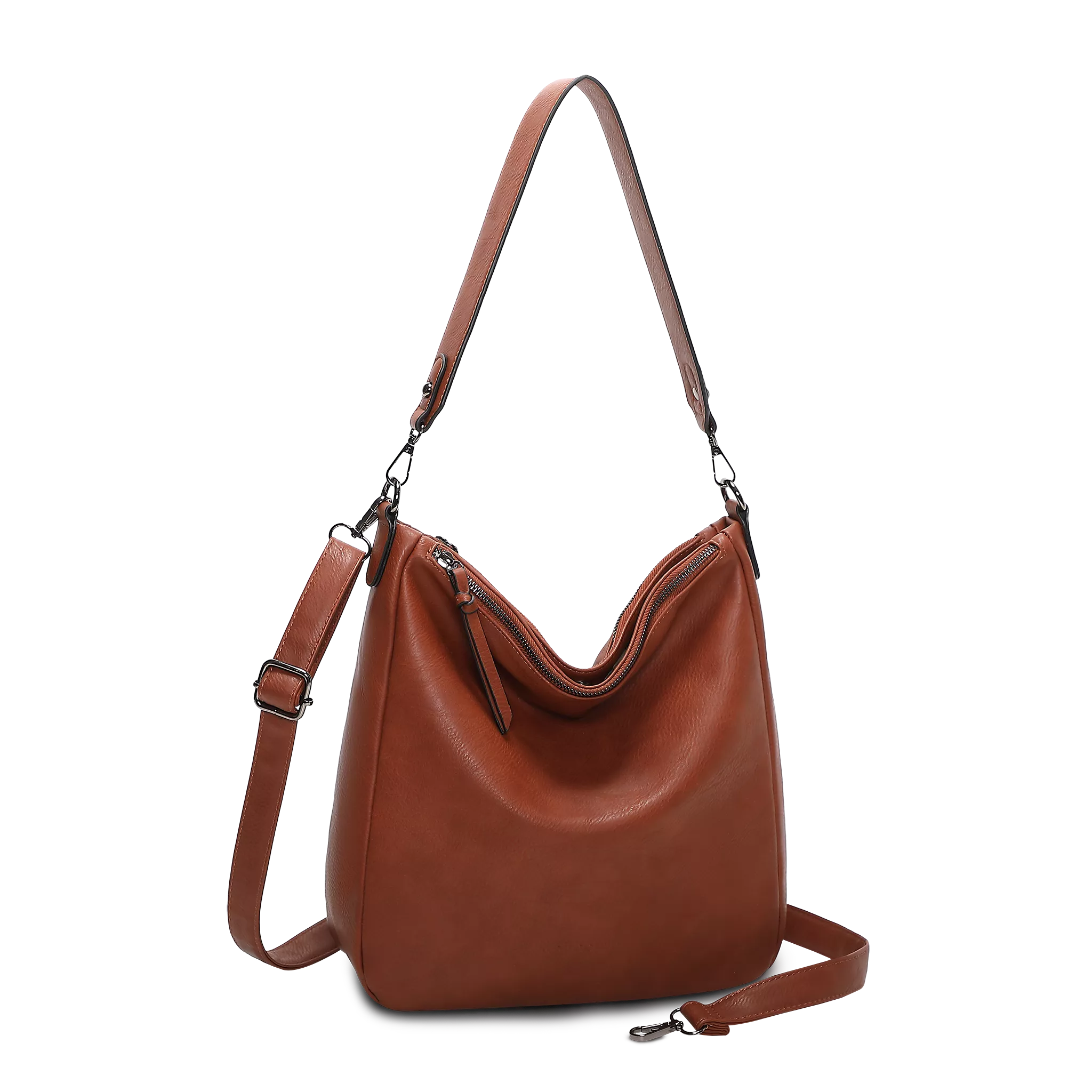 Generös axelväska i hobomodell från Puccini, tillverkad av skinnimitation i läderlook, med tvåtonseffekt. Väskan har tre huvudfack, varav mittfacket stängs med magnetlås, det främre och det bakre stängs med blixtlås. Väskan generösa storlek och fantastiska inredning gör att du enkelt organiserar dina tillhörigheter.