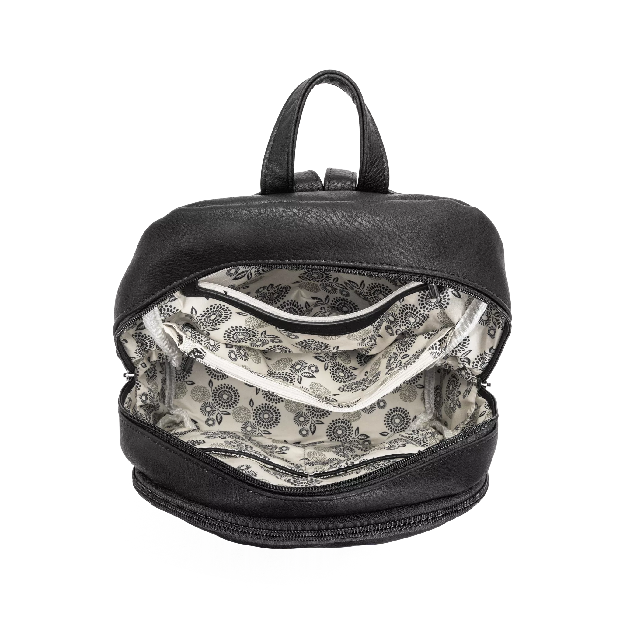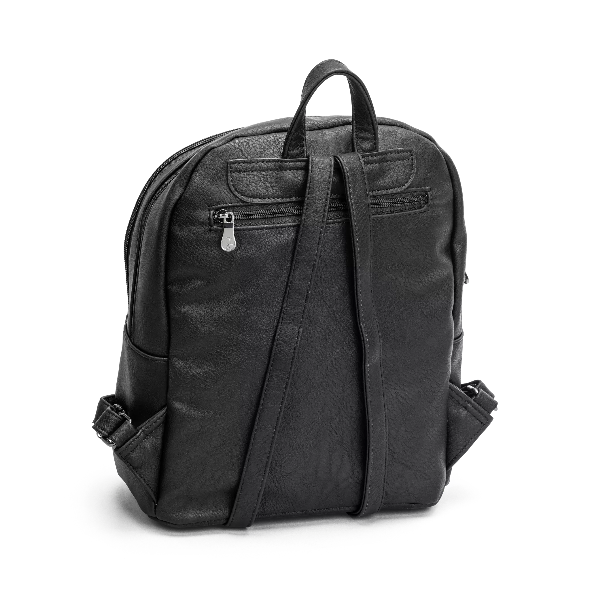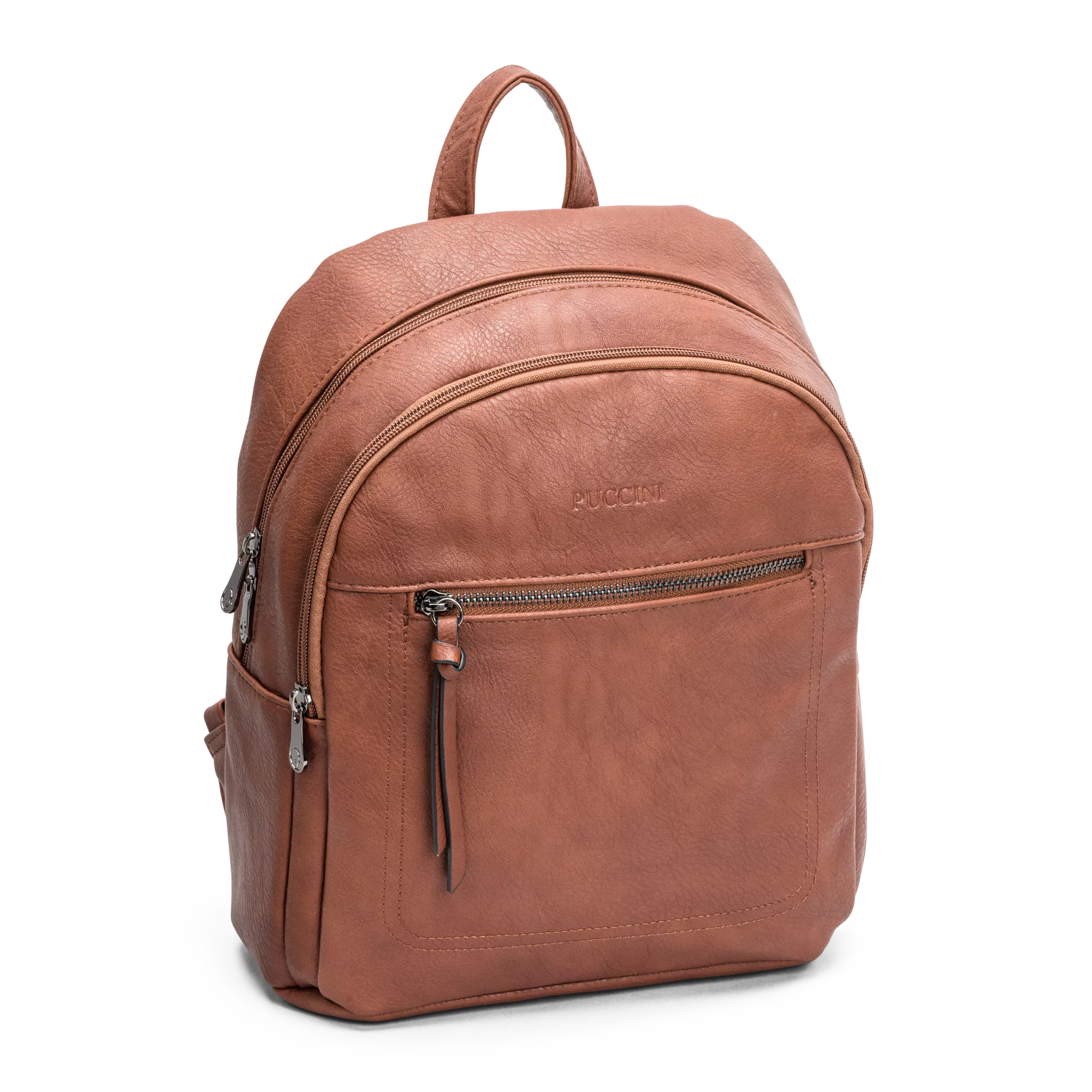 Klassisk, rymlig och välorganiserad ryggsäck från Puccini, i skinnliknande imitation med tvåtonseffekt. En nätt, praktisk och funktionell modell att använda som vardagsryggsäck. Fronten pryds av ett dekorativt och användbart blixtlåsförsett fack. Ryggsäcken har justerbara axelband och en enklare hank upptill. Den har två huvudfack som stängs med blixtlås. Invändigt har det stora facket en mindre blixtlåsförsedd ficka och två öppna fickor för mobil. På baksidan finns ett mindre blixtlåsförsett fack.