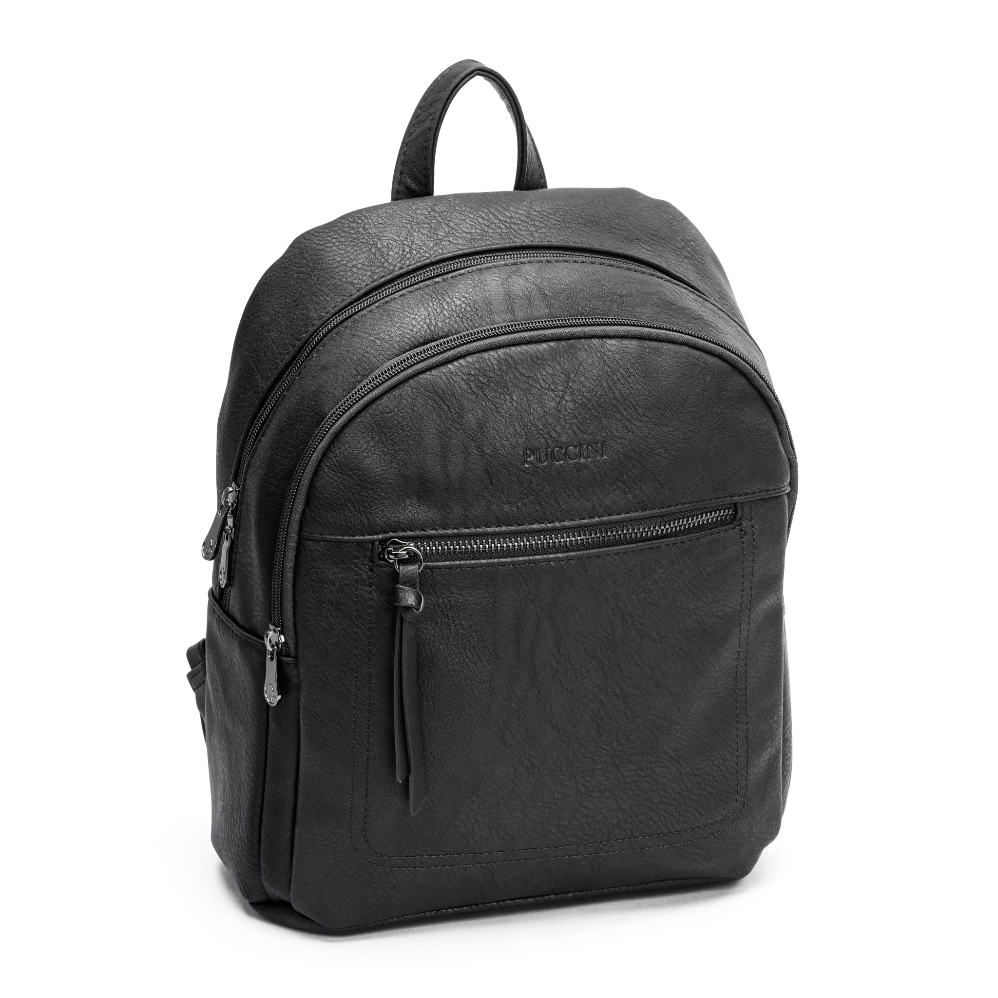 Klassisk, rymlig och välorganiserad ryggsäck från Puccini, i skinnliknande imitation med tvåtonseffekt. En nätt, praktisk och funktionell modell att använda som vardagsryggsäck. Fronten pryds av ett dekorativt och användbart blixtlåsförsett fack. Ryggsäcken har justerbara axelband och en enklare hank upptill. Den har två huvudfack som stängs med blixtlås. Invändigt har det stora facket en mindre blixtlåsförsedd ficka och två öppna fickor för mobil. På baksidan finns ett mindre blixtlåsförsett fack.