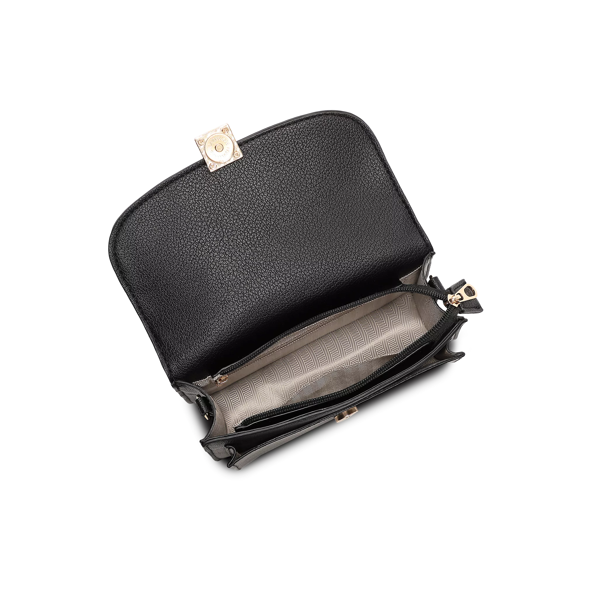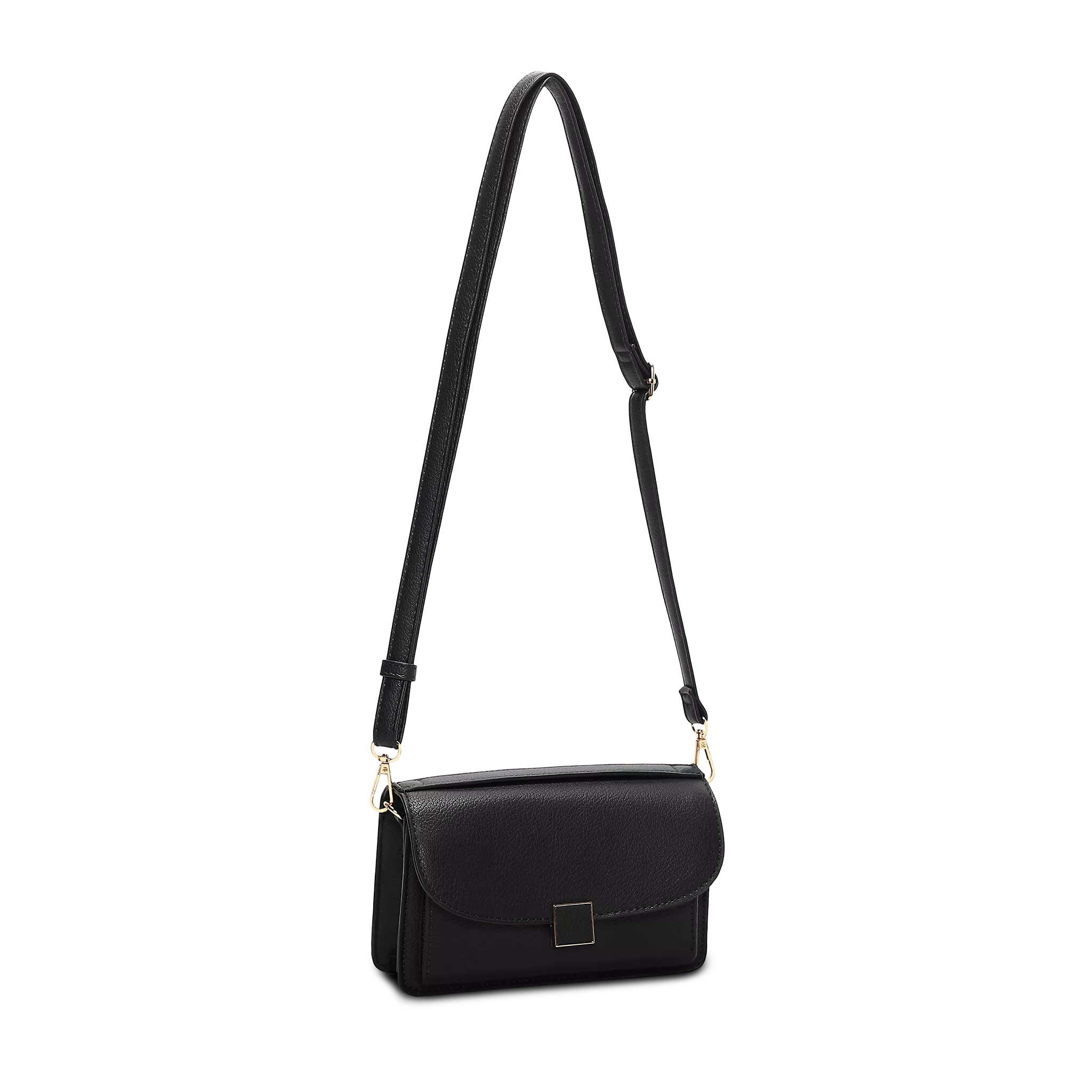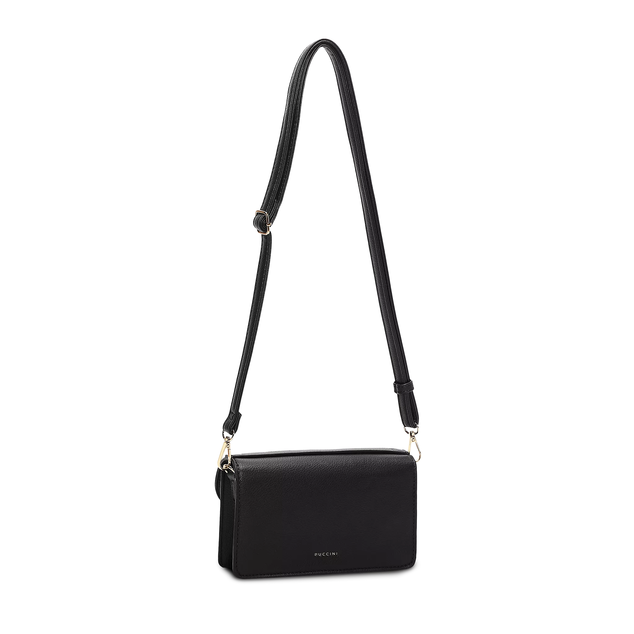 Boxig klaffväska tillverkad av härligt mjuk skinnimitation, från Puccini. Läcker stilren design och detaljer i guld, vilket ger en exklusiv look. Klaffen stängs med magnetlås och huvudfacket stängs med ett blixtlås. På fronten finns ett öppet fack, perfekt för mobilen. Det korta handtaget på toppen ger en trendig touch.