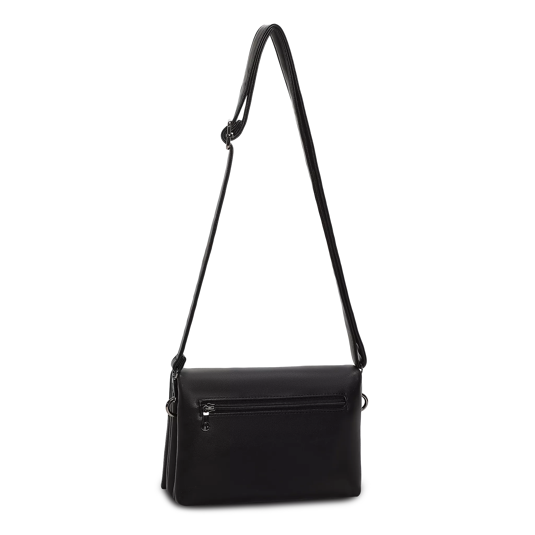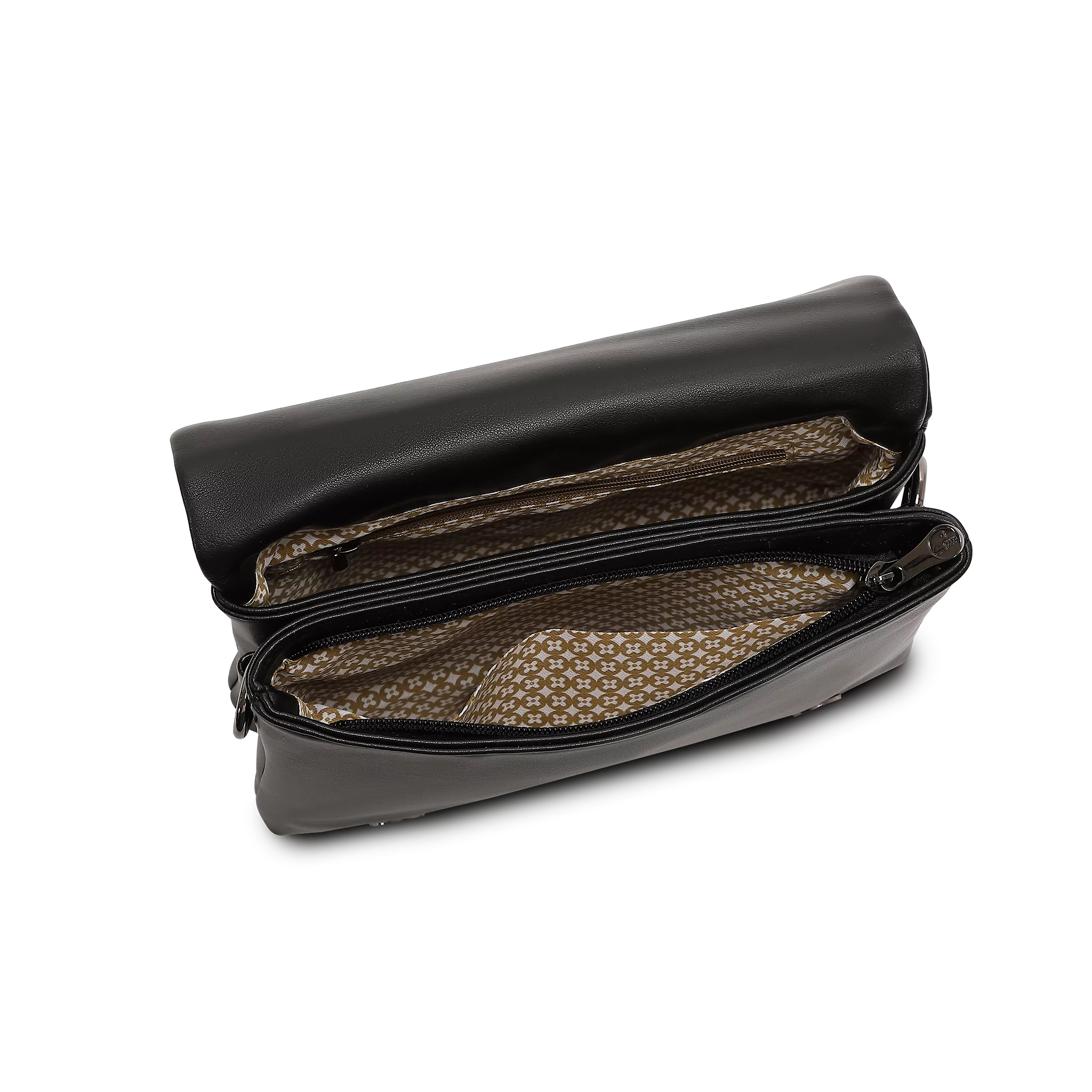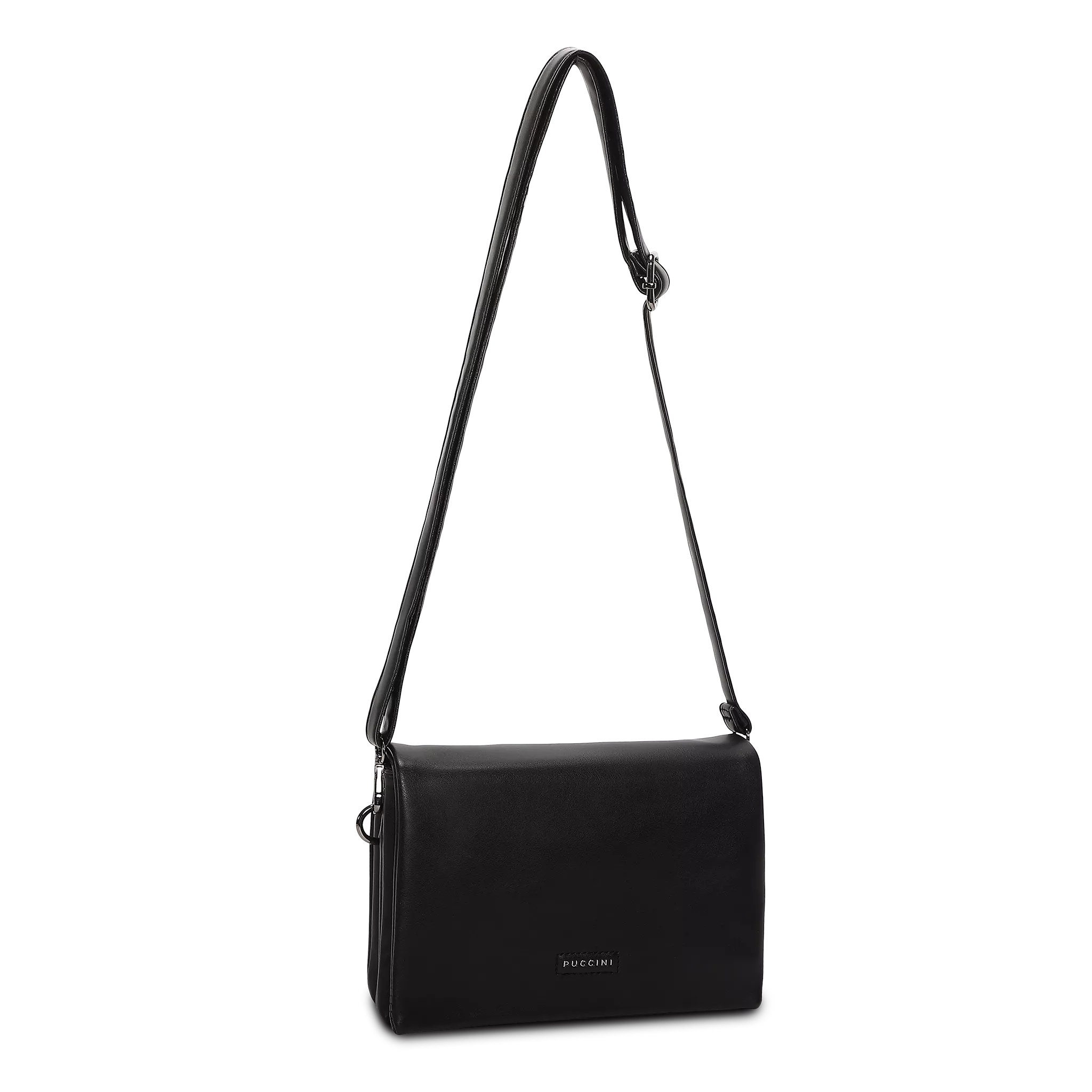 Nätt och stilren klaffväska från Puccini, tillverkad av mjuk, slät skinnimitation. Praktisk modell med dubbla huvudfack, det ena öppet, det andra med blixtlås. Du kan enkelt hålla dina tillhörigheter organiserade. Klaffen stängs med magnetlås.