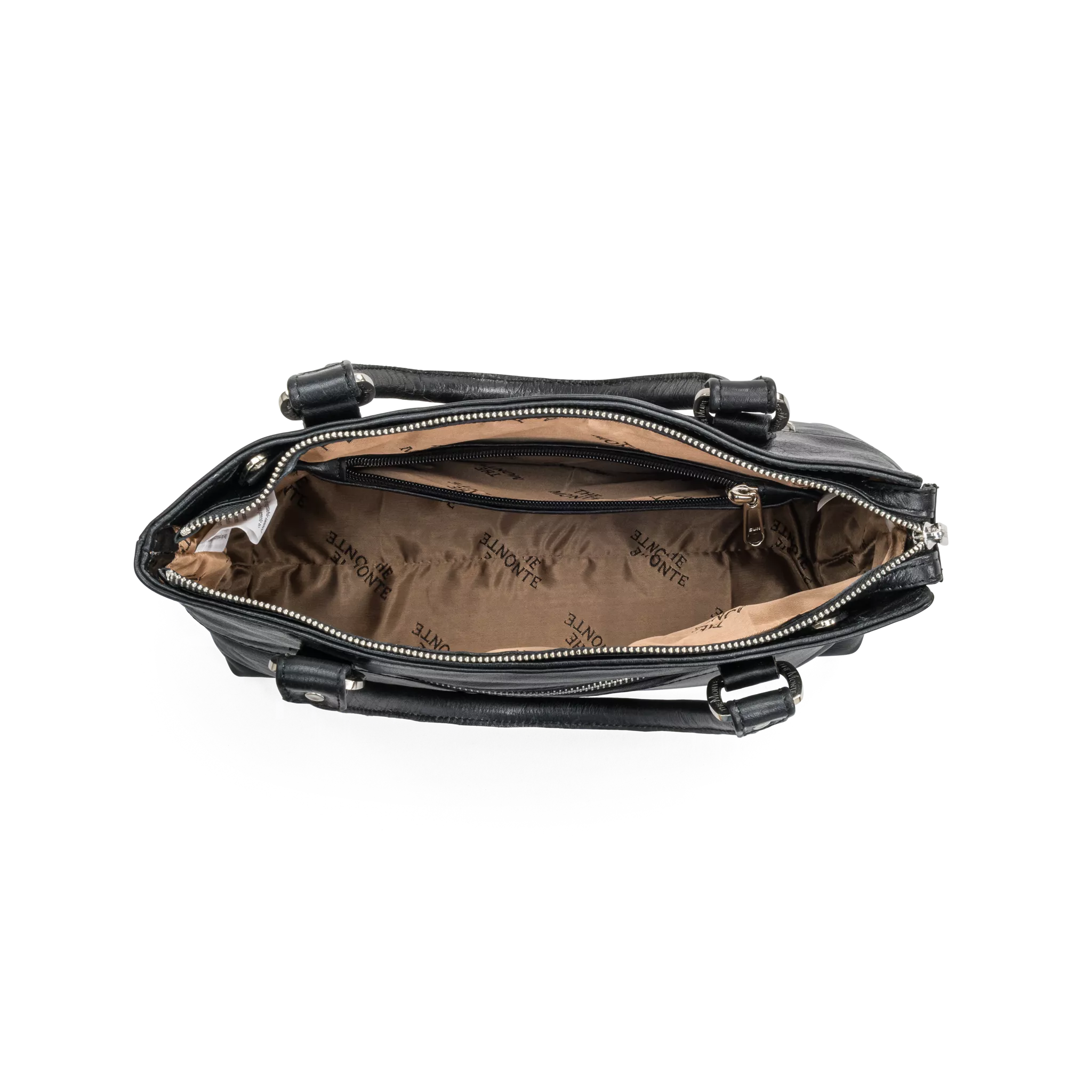 Vacker handväska i mjukt, vegetabiliskt garvat buffelkalvskinn från The Monte. Bär väskan i handen eller på axeln med den medföljande axelremmen. Väskans små metallfötter undertill gör att den står stadigt på bord/golv.